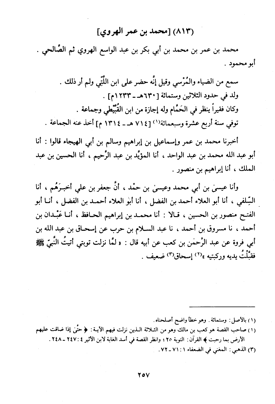 وَأَخْبَرَنَا عِيسَى بْنُ أَبِي مُحَمَّدٍ، وَعِيسَى بْنُ حَمْدٍ، أنا جَعْفَرُ بْنُ عَلِيٍّ أَخْبَرَهُمْ، أنا السَّلَفِيُّ، أنا أَبُو الْعَلاءِ أَحْمَدُ بْنُ الْفَضْلِ، أنا أَبُو الْفَتْحِ مَنْصُورُ بْنُ الْحُسَيْنِ، قَالا: أنا مُحَمَّدُ بْنُ إِبْرَاهِيمَ الْحَافِظُ، أنا عَبْدَانُ بْنُ أَحْمَدَ، نا مَسْرُوقُ بْنُ أَحْمَدَ، نا عَبْدُ السَّلامِ بْنُ حَرْبٍ، عَنْ إِسْحَاقَ بْنِ عَبْدِ اللَّهِ بْنِ أَبِي فَرْوَةَ، عَنْ عَبْدِ الرَّحْمَنِ بْنِ كَعْبٍ، عَنْ أَبِيهِ، قَالَ: لَمَّا نَزَلَتْ تَوْبَتِي أَتَيْتُ النَّبِيَّ صَلَّى اللَّهُ عَلَيْهِ وَسَلَّمَ فَقَبَّلْتُ يَدَيْهِ وَرُكْبَتَيْهِ، إِسْحَاقُ ضَعِيفٌ