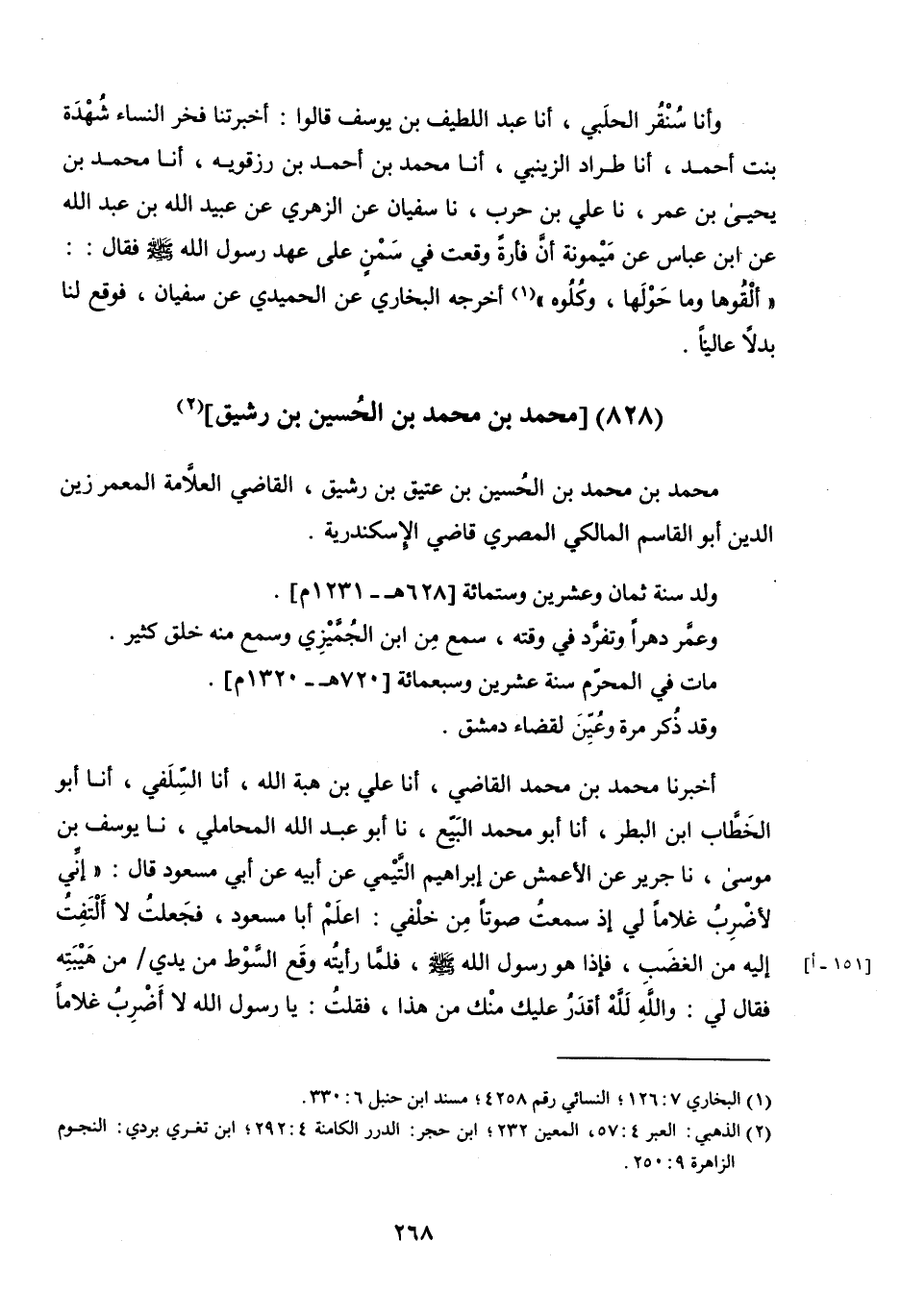 وأنا سُنْقُرُ الْحَلَبِيُّ، أنا عَبْدُ اللَّطِيفِ بْنُ يُوسُفَ، قَالُوا: أَخْبَرَتْنَا فَخْرُ النِّسَاءِ شُهْدَةُ بِنْتُ أَحْمَدَ، أنا طِرَادٌ الزَّيْنَبِيُّ، أنا مُحَمَّدُ بْنُ أَحْمَدَ بْنِ رِزْقُوَيْهِ، أنا مُحَمَّدُ بْنُ يَحْيَى بْنِ عُمَرَ، نا عَلِيُّ بْنُ حَرْبٍ، نا سُفْيَانُ، عَنِ الزُّهْرِيِّ، عَنْ عُبَيْدِ اللَّهِ، عَنِ ابْنِ عَبَّاسٍ، عَنْ مَيْمُونَةَ أَنَّ فَأْرَةً وَقَعَتْ فِي سَمْنٍ عَلَى عَهْدِ رَسُولِ اللَّهِ صَلَّى اللَّهُ عَلَيْهِ وَسَلَّمَ فَقَالَ: «أَلْقُوهَا وَمَا حَوْلَهَا، وَكُلُوهُ» .