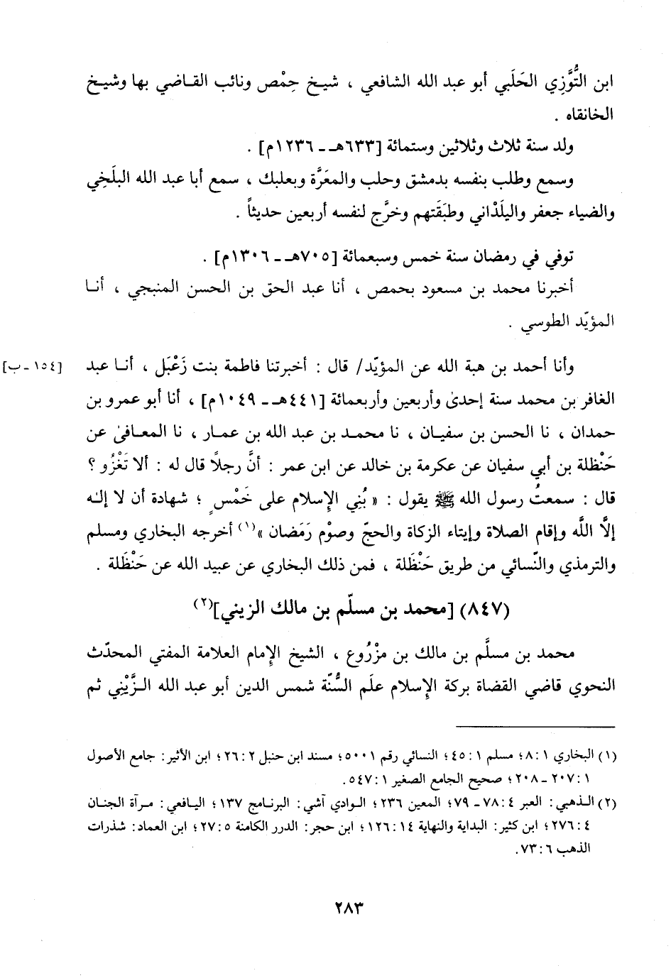 وَأنا أَحْمَدُ بْنُ هِبَةِ اللَّهِ، عَنِ الْمُؤَيَّدِ، قَالَ: أَخْبَرَتْنَا فَاطِمَةُ بِنْتُ زَعْبَلٍ، أنا عَبْدُ الْغَفَّارِ بْنُ مُحَمَّدٍ، سَنَةَ إِحْدَى وَأَرْبَعِينَ وَأَرْبَعِ مِائَةٍ، أنا أَبُو عَمْرِو بْنُ حَمْدَانَ، نا الْحَسَنُ بْنُ سُفْيَانَ، نا مُحَمَّدُ بْنُ عَبْدِ اللَّهِ بْنِ عَمَّارٍ، نا الْمُعَافَى، عَنْ حَنْظَلَةَ بْنِ أَبِي سُفْيَانَ، عَنْ عِكْرِمَةَ بْنِ خَالِدٍ، عَنِ ابْنِ عُمَرَ: أَنَّ رَجُلا، قَالَ لَهُ: أَلا تَغْزُو؟ قَالَ: سَمِعْتُ رَسُولَ اللَّهِ صَلَّى اللَّهُ عَلَيْهِ وَسَلَّمَ يَقُولُ: " بُنِيَ الإِسْلامُ عَلَى خَمْسٍ: شَهَادَةِ أَنْ لا إِلَهَ إِلا اللَّهُ، وَإِقَامِ الصَّلاةِ، وَإِيتَاءِ الزَّكَاةِ، وَالْحَجِّ، وَصَوْمِ رَمَضَانَ ".