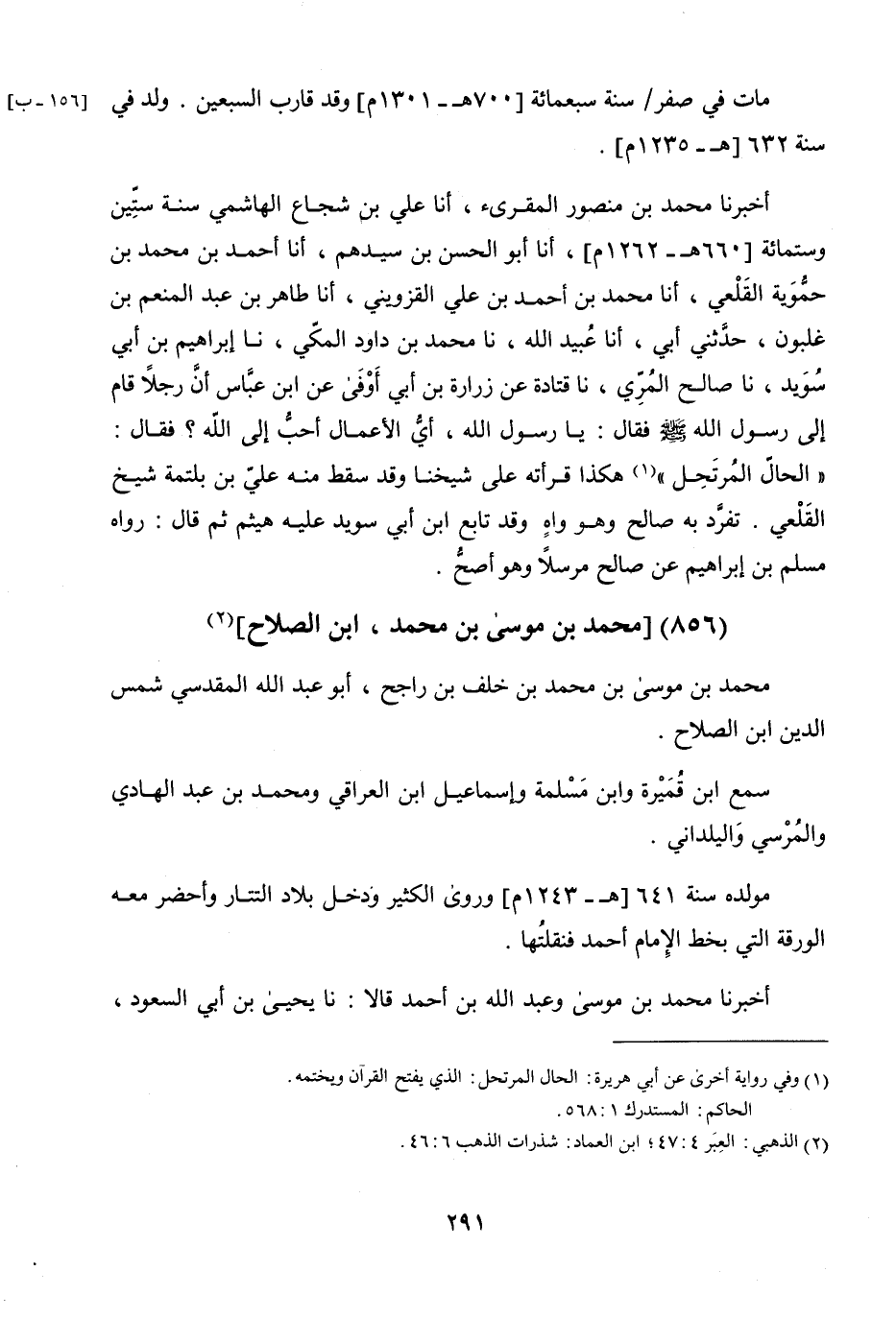 أَخْبَرَنَا مُحَمَّدُ بْنُ مَنْصُورٍ الْمُقْرِئُ، أنا عَلِيُّ بْنُ شُجَاعٍ الْهَاشِمِيُّ، سَنَةَ سِتِّينَ وَسِتِّ مِائَةٍ، أنا أَبُو الْحَسَنِ ابْنُ سَيِّدِهِمْ، أنا أَحْمَدُ بْنُ مُحَمَّدِ بْنِ حَمُّوَيْهِ الْقَلْعِيُّ، أنا مُحَمَّدُ بْنُ أَحْمَدَ بْنِ عَلِيٍّ الْقَزْوِينِيُّ، أنا طَاهِرُ بْنُ عَبْدِ الْمُنْعِمِ بْنِ غَلْبُونٍ، حَدَّثَنِي أَبِي، أنا عُبَيْدُ اللَّهِ، نا مُحَمَّدُ بْنُ دَاوُدَ الْمَكِّيُّ، نا إِبْرَاهِيمُ بْنُ أَبِي سُوَيْدٍ، نا صَالِحٌ الْمَرِّيُّ، نا قَتَادَةُ، عَنْ زُرَارَةَ بْنِ أَبِي أَوْفَى، عَنِ ابْنِ عَبَّاسٍ، أَنَّ رَجُلا قَامَ عَلَى رَسُولِ اللَّهِ صَلَّى اللَّهُ عَلَيْهِ وَسَلَّمَ فَقَالَ: يَا رَسُولَ اللَّهِ، أَيُّ الأَعْمَالِ أَحَبُّ إِلَى اللَّهِ؟ فَقَالَ: «الْحَالُّ الْمُرْتَحِلُ» .