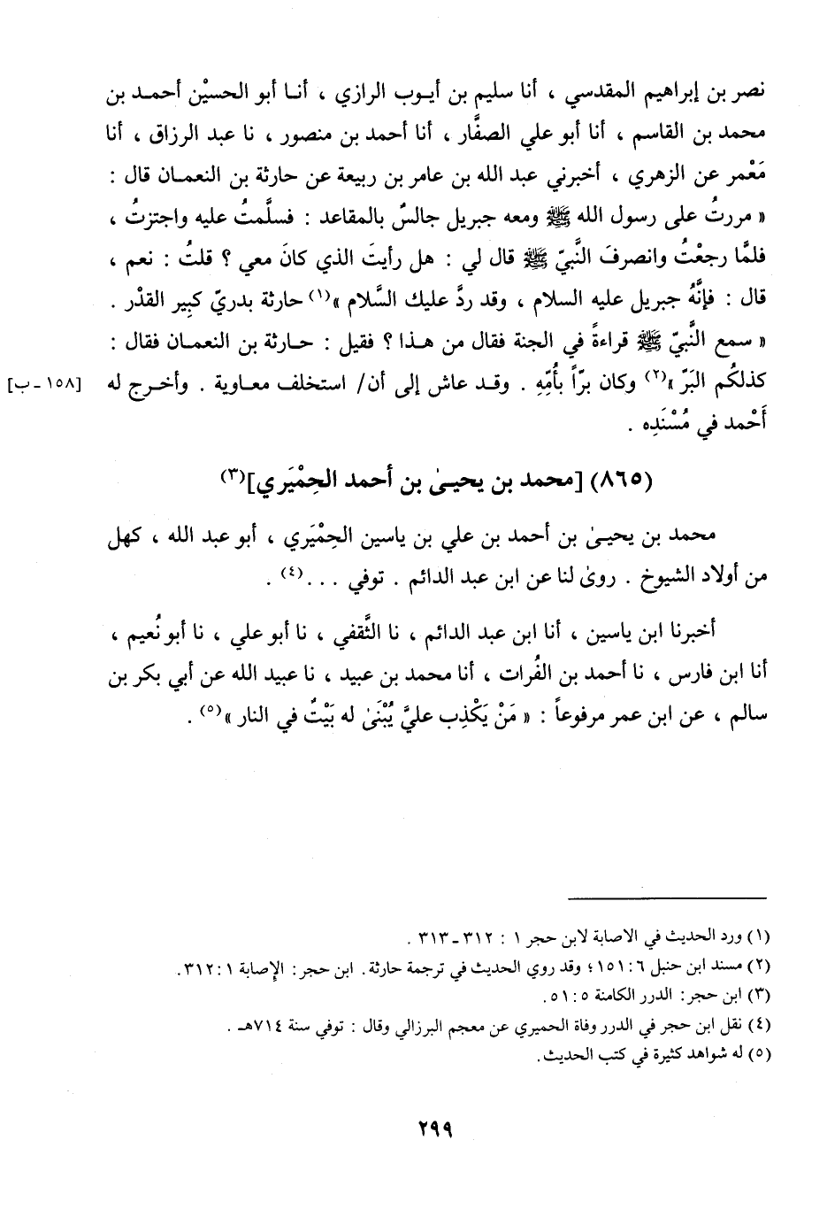 بْنُ إِبْرَاهِيمَ الْمَقْدِسِيُّ، أنا سُلَيْمُ بْنُ أَيُّوبَ الرَّازِيُّ، أنا أَبُو الْحُسَيْنِ أَحْمَدُ بْنُ مُحَمَّدِ بْنِ الْقَاسِمِ، أنا أَبُو عَلِيٍّ الصَّفَّارُ، أنا أَحْمَدُ بْنُ مَنْصُورٍ، نا عَبْدُ الرَّزَّاقِ، أنا مَعْمَرٌ، عَنِ الزُّهْرِيِّ، أَخْبَرَنِي عَبْدُ اللَّهِ بْنُ عَامِرِ بْنِ رَبِيعَةَ، عَنْ حَارِثَةَ بْنِ النُّعْمَانِ، قَالَ: مَرَرْتُ عَلَى رَسُولِ اللَّهِ صَلَّى اللَّهُ عَلَيْهِ وَسَلَّمَ وَمَعَهُ جِبْرِيلُ جَالِسٌ بِالْمَقَاعِدِ، فَسَلَّمْتُ عَلَيْهِ، وَاجْتَزْتُ، فَلَمَّا رَجَعْتُ وَانْصَرَفَ النَّبِيُّ صَلَّى اللَّهُ عَلَيْهِ وَسَلَّمَ قَالَ لِي: «هَلْ رَأَيْتَ الَّذِي كَانَ مَعِي؟» قُلْتُ: نَعَمْ، قَالَ: «فَإِنَّهُ جِبْرِيلُ عَلَيْهِ السَّلامُ، وَقَدْ رَدَّ عَلَيْكَ السَّلامَ» حَارِثَةُ بَدْرِيٌّ كَبِيرُ الْقَدْرِ