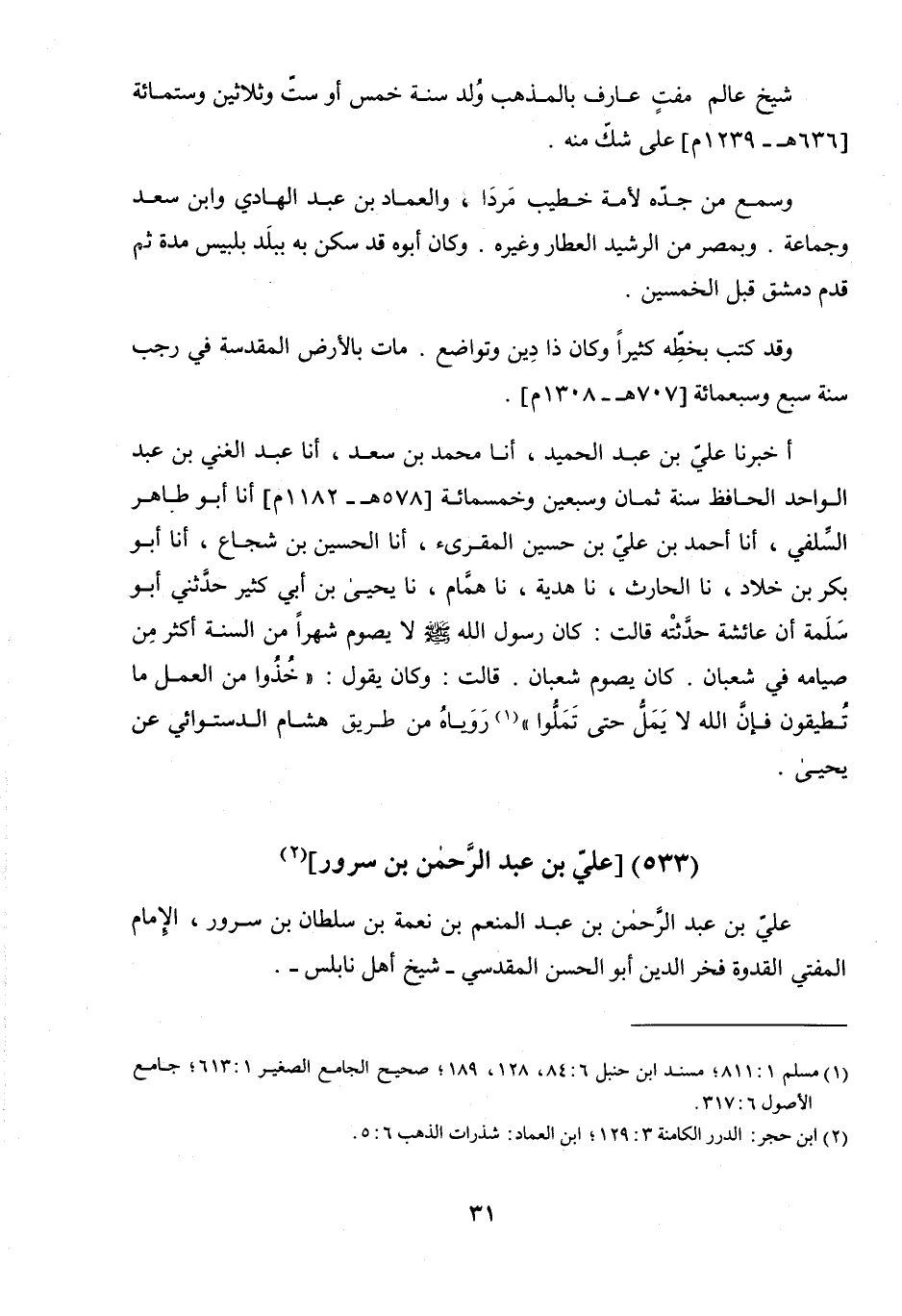 عَلِيُّ بْنُ عَبْدِ الرَّحْمَنِ بْنِ عَبْدِ الْمُنْعِمِ بْنِ نِعْمَةَ بْنِ سُلْطَانِ بْنِ سُرُورٍ الإِمَامُ الْمُفْتِي الْقُدْوَةُ فَخْرُ الدِّينِ أَبُو الْحَسَنِ الْمَقْدِسِيُّ