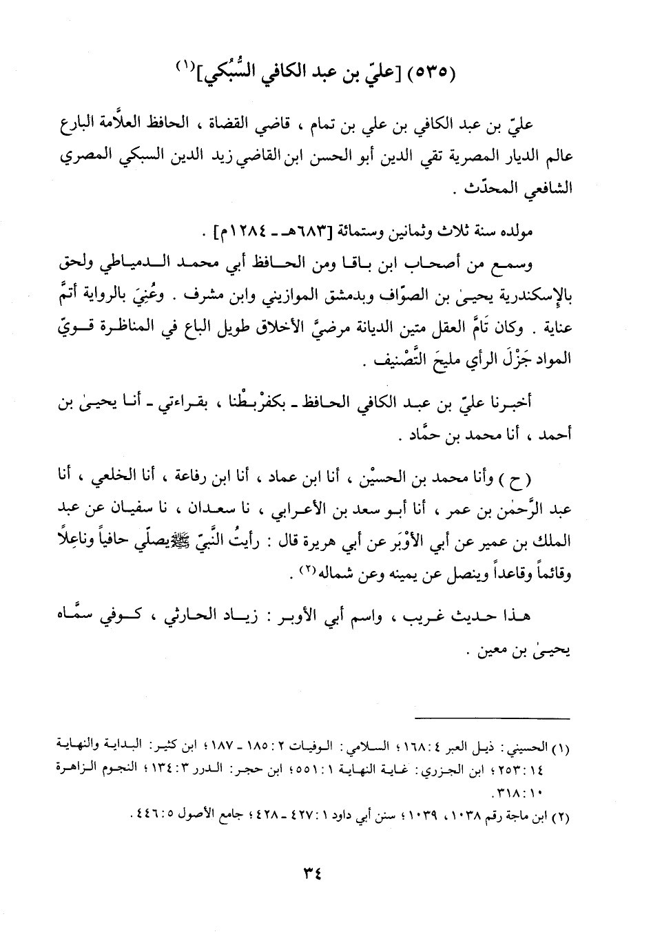 عَلِيُّ بْنُ عَبْدِ الْكَافِي بْنِ عَلِيِّ بْنِ تَمَّامٍ قَاضِي الْقُضَاةِ الْحَافِظُ الْعَلامَةُ الْبَارِعُ عَالِمُ الدِّيَارِ الْمِصْرِيَّةِ تَقِيُّ الدِّينِ أَبُو الْحَسَنِ الْقَاضِي زَيْدُ الدِّينِ السُّبْكِيُّ الْمِصْرِيُّ الشَّافِعِيُّ الْمُحَدِّثُ