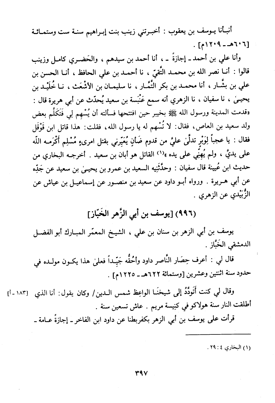 يُوسُفُ بْنُ أَبِي الزُّهْرِ بْنِ سِنَانِ بْنِ عَلِيٍّ الشَّيْخُ الْمُعَمَّرُ الْمُبَارَكُ أَبُو الْفَضْلِ الدِّمَشْقِيُّ الْخَبَّازُ