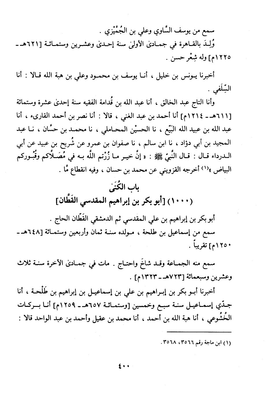 وَأنا التَّاجُ عَبْدُ الْخَالِقِ، أنا عَبْدُ اللَّهِ بْنُ قُدَامَةَ الْفَقِيهُ، سَنَةَ إِحْدَى عَشْرَةَ وَسَبْعِ مِائَةٍ، أنا أَحْمَدُ بْنُ عَبْدِ الْغَنِيِّ، قَالا: أنا نَصْرُ بْنُ أَحْمَدَ الْقَارِئُ، أنا عَبْدُ اللَّهِ بْنُ عُبَيْدِ اللَّهِ الْبَيِّعُ، نا الْحُسَيْنُ الْمَحَامِلِيُّ، نا مُحَمَّدُ بْنُ حَسَّانٍ، نا عَبْدُ الْمَجِيدِ بْنُ أَبِي دُاوُدَ، نا ابْنُ سَالِمٍ، نا صَفْوَانُ بْنُ عَمْرٍو، عَنْ شُرَيْحِ بْنِ عُبَيْدٍ، عَنْ أَبِي الدَّرْدَاءِ، قَالَ: قَالَ النَّبِيُّ صَلَّى اللَّهُ عَلَيْهِ وَسَلَّمَ: «إِنَّ خَيْرَ مَا زُرْتُمُ اللَّهَ بِهِ فِي مُصَلاكُمْ وَقُبُورِكُمُ الْبَيَاضُ» .