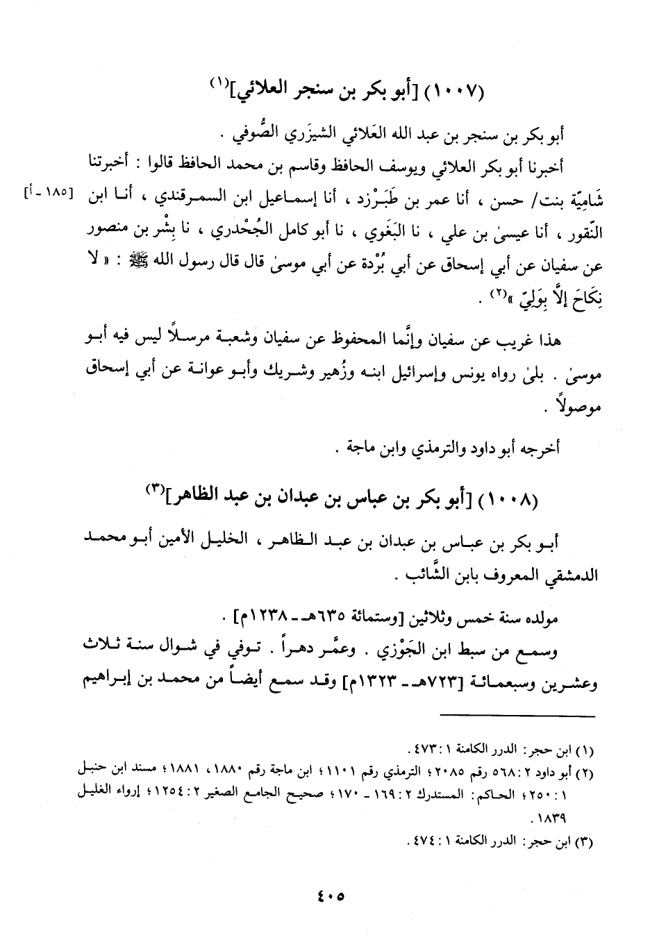 أَخْبَرَنَا أَبُو بَكْرٍ الْعَلانِيُّ، وَيُوسُفُ الْحَافِظُ، وَقَاسِمُ بْنُ مُحَمَّدٍ الْحَافِظُ، قَالُوا: أَخْبَرَتْنَا شَامِيَّةُ بِنْتُ حَسَنٍ، أنا عُمَرُ بْنُ طَبَرْزَدَ، أنا إِسْمَاعِيلُ بْنُ السَّمَرْقَنْدِيِّ، أنا ابْنُ النَّقُّورِ، أنا عِيسَى بْنُ عَلِيٍّ، نا أَبُو كَامِلٍ الْجَحْدَرِيُّ، نا بِشْرُ بْنُ مَنْصُورٍ، عَنْ سُفْيَانَ، عَنْ أَبِي إِسْحَاقَ، عَنْ أَبِي بُرْدَةَ، عَنْ أَبِي مُوسَى، قَالَ: قَالَ رَسُولُ اللَّهِ صَلَّى اللَّهُ عَلَيْهِ وَسَلَّمَ: «لا نِكَاحَ إِلا بِوَلِيٍّ» .