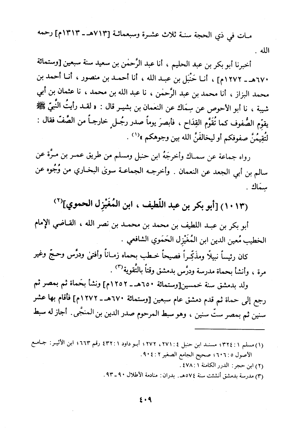أَخْبَرَنَا أَبُو بَكْرِ بْنُ عَبْدِ الْحَلِيمِ، أنا عَبْدُ الرَّحْمَنِ بْنُ سَعِيدٍ، سَنَةَ سَبْعِينَ وَسِتِّ مِائَةٍ، أنا حَنْبَلُ بْنُ عَبْدِ اللَّهِ، أنا أَحْمَدُ بْنُ مَنْصُورٍ، أنا أَحْمَدُ بْنُ مُحَمَّدٍ الْبَزَّازُ، أنا مُحَمَّدُ بْنُ عَبْدِ الرَّحْمَنِ، نا عَبْدُ اللَّهِ بْنُ مُحَمَّدٍ، نا عُثْمَانُ بْنُ أَبِي شَيْبَةَ، نا أَبُو الأَحْوَصِ، عَنْ سِمَاكٍ، عَنِ النُّعْمَانِ بْنِ بَشِيرٍ، قَالَ: لَقَدْ رَأَيْتُ النَّبِيَّ صَلَّى اللَّهُ عَلَيْهِ وَسَلَّمَ يُقَوِّمُ الصُّفُوفَ كَمَا تُقَوَّمُ الْقِدَاحُ، فَأَبْصَرَ يَوْمًا صَدْرَ رَجُلٍ خَارِجًا مِنَ الصَّفِّ , فَقَالَ: «لَتُقِيمَنَّ صُفُوفَكُمْ أَوْ لَيُخَالِفَنَّ اللَّهُ بَيْنَ وُجُوهِكُمْ» .