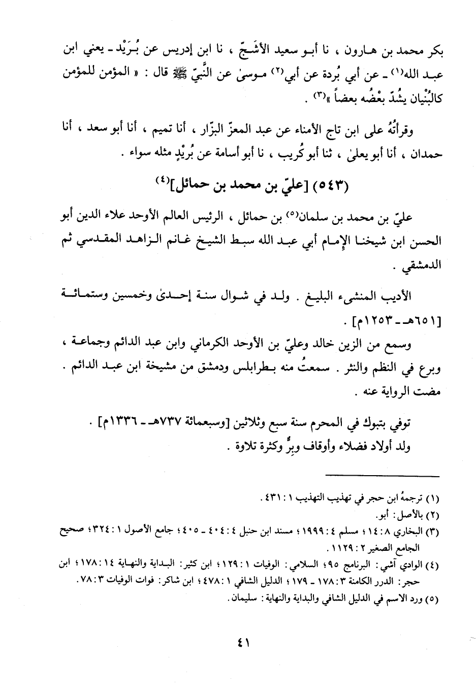 بَكْرٍ مُحَمَّدُ بْنُ هَارُونَ، نا أَبُو سَعِيدٍ الأَشَجُّ، نا ابْنُ إِدْرِيسَ عَنْ بُرَيْدٍ يَعْنِي ابْنَ عَبْدِ اللَّهِ، عَنْ أَبِي بُرْدَةَ، عَنْ أَبِي مُوسَى، عَنِ النَّبِيِّ صَلَّى اللَّهُ عَلَيْهِ وَسَلَّمَ قَالَ: «الْمُؤْمِنُ لِلْمُؤْمِنِ كَالْبُنْيَانِ يَشُدُّ بَعْضُهُ بَعْضًا» .