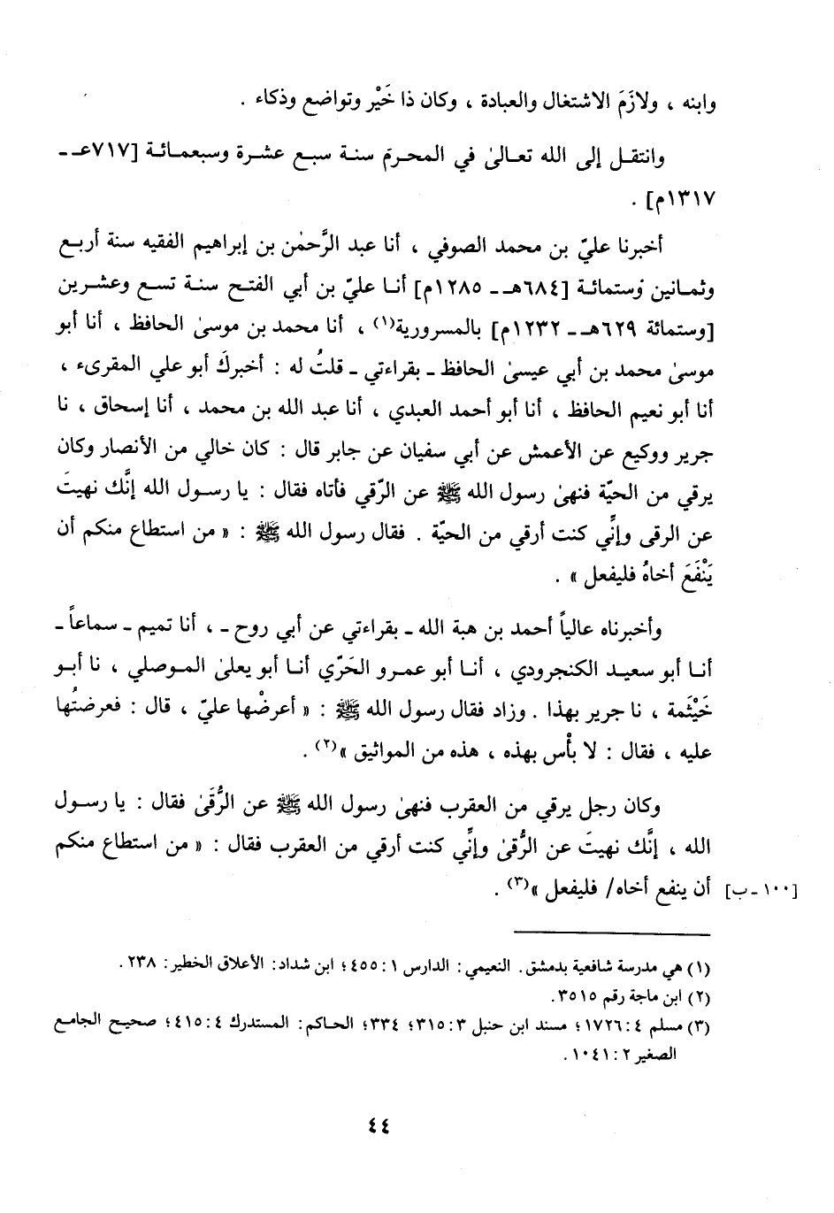 أَخْبَرَنَا عَلِيُّ بْنُ مُحَمَّدٍ الصُّوفِيُّ، أنا عَبْدُ الرَّحْمَنِ بْنُ إِبْرَاهِيمَ الْفَقِيهُ، سَنَةَ أَرْبَعٍ وَثَمَانِينَ وَسِتِّ مِائَةٍ، أنا عَلِيُّ بْنُ أَبِي الْفَتْحِ، سَنَةَ تِسْعٍ وَعِشْرِينَ وَسِتِّ مِائَةٍ بِالْمَسْرُورِيَّةِ، أنا مُحَمَّدُ بْنُ مُوسَى الْحَافِظُ، نا أَبُو مُوسَى مُحَمَّدُ بْنُ أَبِي عِيسَى الْحَافِظُ، بِقِرَاءَتِي، قُلْتُ لَهُ: أَخْبَرَكَ أَبُو عَلِيٍّ الْمُقْرِئُ، أنا أَبُو نُعَيْمٍ الْحَافِظُ، أنا أَبُو أَحْمَدَ الْعَبْدِيُّ، أنا عَبْدُ اللَّهِ بْنُ مُحَمَّدٍ، أنا إِسْحَاقُ، نا جَرِيرٌ، وَوَكِيعٌ، عَنِ الأَعْمَشِ، عَنْ أَبِي سُفْيَانَ، عَنْ جَابِرٍ، قَالَ: كَانَ خَالِي مِنَ الأَنْصَارِ، وَكَانَ يُرْقِي مِنَ الْحَيَّةِ فَنَهَى رَسُولُ اللَّهِ صَلَّى اللَّهُ عَلَيْهِ وَسَلَّمَ عَنِ الرُّقَى فَأَتَاهُ فَقَالَ: يَا رَسُولَ اللَّهِ، إِنَّكَ نَهَيْتَ عَنِ الرُّقَى، وَإِنِّي كُنْتُ أَرْقِي مِنَ الْحَيَّةِ، فَقَالَ رَسُولُ اللَّهِ صَلَّى اللَّهُ عَلَيْهِ وَسَلَّمَ: «مَنِ اسْتَطَاعَ مِنْكُمْ أَنْ يَنْفَعَ أَخَاهُ فَلْيَفْعَلْ» .