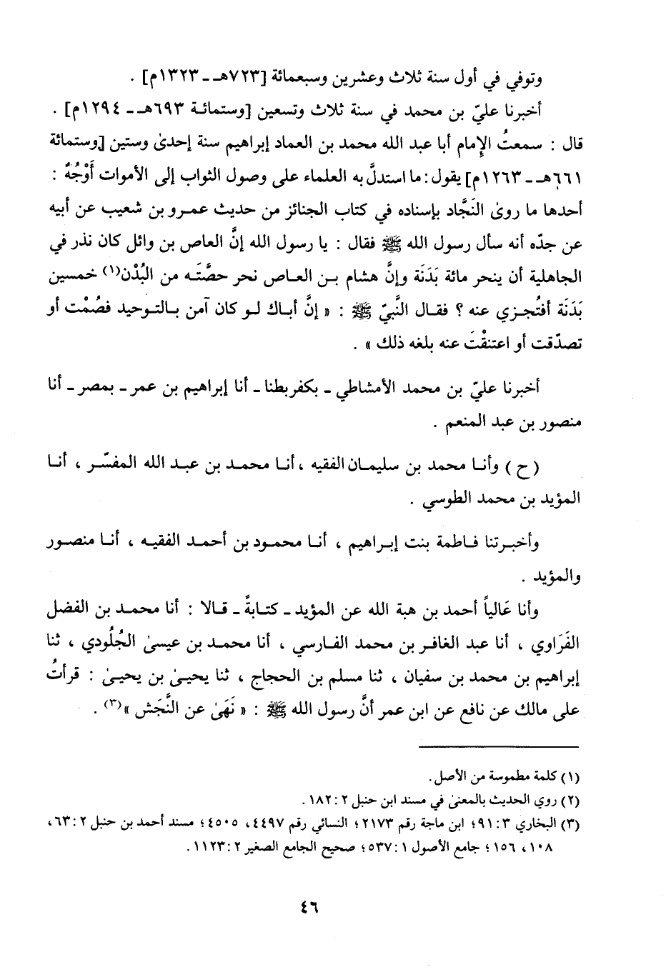 أَخْبَرَنَا عَلِيُّ بْنُ مُحَمَّدٍ، فِي سَنَةِ ثَلاثٍ وَتِسْعِينَ وَسِتِّ مِائَةٍ، وَقَالَ: سَمِعْتُ الإِمَامَ أَبَا عَبْدِ اللَّهِ مُحَمَّدَ بْنَ الْعِمَادِ إِبْرَاهِيمَ، سَنَةَ إِحْدَى وَسِتِّينَ وَسِتِّ مِائَةٍ، يَقُولُ: مَا اسْتَدَلَ بِهِ الْعُلَمَاءُ عَلَى وُصُولِ الثَّوَابِ إِلَى الأَمْوَاتِ أَوْجُهٌ: أَحَدُهَا مَا رَوَى النَّجَّادُ بِإِسْنَادِهِ فِي كِتَابِ الْجَنَائِزِ مِنْ حَدِيثِ عَمْرِو بْنِ شُعَيْبٍ، عَنْ أَبِيهِ، عَنْ جَدِّهِ، أَنَّهُ سَأَلَ رَسُولَ اللَّهِ صَلَّى اللَّهُ عَلَيْهِ وَسَلَّمَ فَقَالَ: يَا رَسُولَ اللَّهِ إِنَّ الْعَاصَ بْنَ وَائِلٍ كَانَ نَذَرَ فِي الْجَاهِلِيَّةِ أَنْ يَنْحَرَ مِائَةَ بَدَنَةٍ، وَإِنَّ هِشَامَ بْنَ الْعَاصِ نَحَرَ حِصَّتَهُ مِنَ الْبُدْنِ خَمْسِينَ أَفَتُجْزِي عَنْهُ؟ فَقَالَ النَّبِيُّ صَلَّى اللَّهُ عَلَيْهِ وَسَلَّمَ: «إِنَّ أَبَاكَ لَوْ كَانَ آمَنَ بِالتَّوْحِيدِ فَصُمْتَ أَوْ تَصَدَّقْتَ أَوِ اعْتَنَقْتَ عَنْهُ بَلَغَهُ ذَلِكَ»