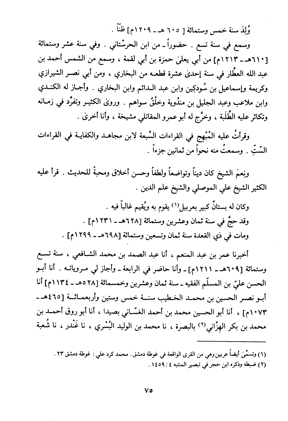 أَخْبَرَنَا عُمَرُ بْنُ عَبْدِ الْمُنْعِمِ، أنا عَبْدُ الصَّمَدِ بْنُ مُحَمَّدٍ الشَّافِعِيُّ، سَنَةَ تِسْعٍ وَسِتِّ مِائَةٍ، وَأَنَا حَاضِرٌ فِي الرَّابِعَةِ، وَأَجَازَ لِي مَرْوِيَّاتِهِ، أنا أَبُو الْحَسَنِ عَلِيُّ بْنُ الْمُسْلِمِ الْفَقِيهُ، سَنَةَ ثَمَانٍ وَعِشْرِينَ وَخَمْسِ مِائَةٍ، أنا أَبُو نَصْرٍ الْحُسَيْنُ بْنُ مُحَمَّدٍ الْخَطِيبُ، سَنَةَ خَمْسٍ وَسِتِّينَ وَأَرْبَعِ مِائَةٍ، أنا أَبُو الْحُسَيْنِ مُحَمَّدُ بْنُ أَحْمَدَ الْغَسَّانِيُّ، بِصَيْدَا، أنا أَبُو رَوْقٍ أَحْمَدُ بْنُ مُحَمَّدِ بْنِ بَكْرٍ الْهِزَّانِيُّ، بِالْبَصْرَةِ، نا مُحَمَّدُ بْنُ الْوَلِيدِ الْبُسْرِيُّ، نا غُنْدَرٌ، نا شُعْبَةُ،