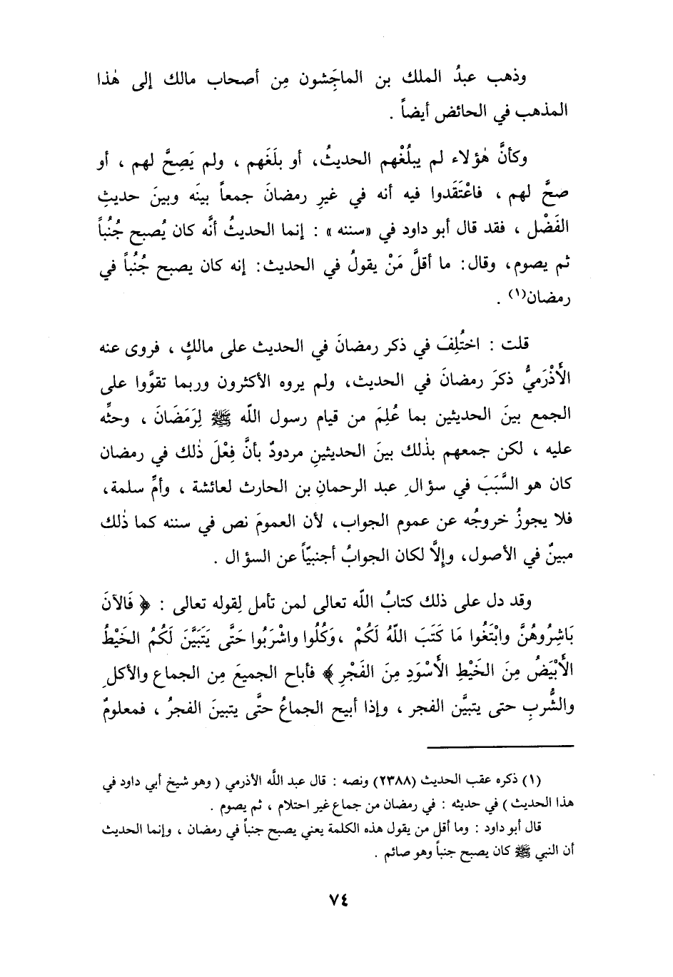 قال أبو داود: وما أقل من يقول هذه الكلمة يعني يصبح جنباً في رمضان، وإنما الحديث أن النبي - صلى الله عليه وسلم - كان يصبح جنباً وهو صائم.