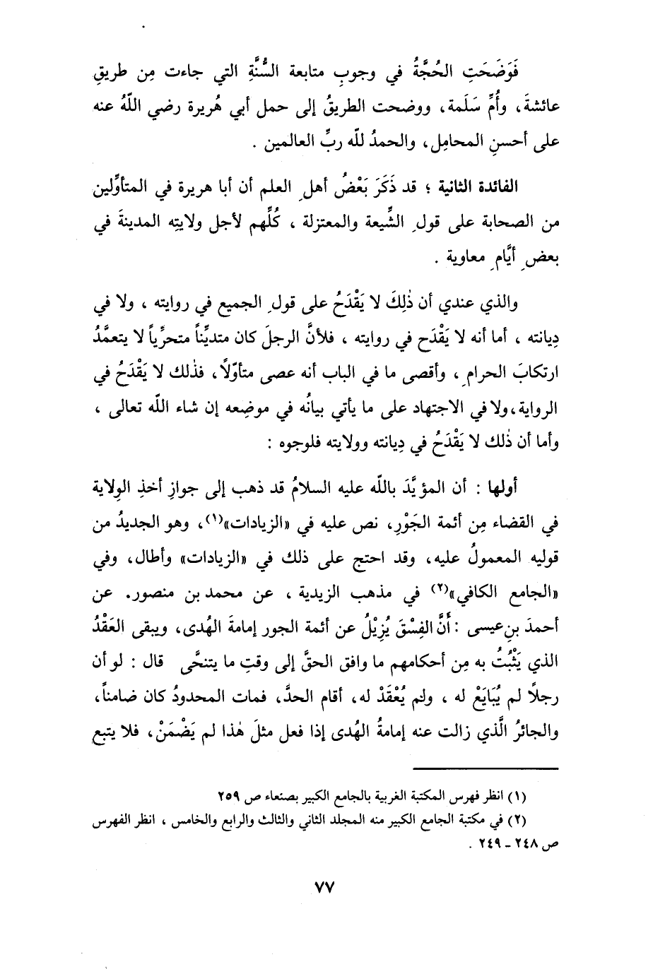 أولها: أن المؤيَّدَ بالله عليه السلامُ قد ذهب إلى جوازِ أخذِ الوِلاية في القضاء من أئمة الجَوْرِ، نص عليه في " الزيادات " (¬1)، وهو الجديدُ من قوليه المعمول عليه، وقد احتج على ذلك في " الزيادات " وأطال، وفي " الجامع الكافي " (¬2) في مذهب الزيدية، عن محمد بن منصور. عن أحمدَ بنِ عيسى: أنَّ الفِسْقَ يُزِيْلُ عن أئمة الجور إمامة الهُدى، ويبقى العَقْدُ الذي يثبُتُ به مِن أحكامهم ما وافق الحقَّ إلى وقتِ ما يتنحَّى قال: لو أن رجلاً لم يُبايَعْ له، ولم يُعْقدْ له، أقام الحدَّ، فمات المحدودُ كان ضامناً، والجائرُ الذي زالت عنه إمامةُ الهُدى إذا فعل مثلَ هذا لم يَضْمَنْ، فلا يتبع