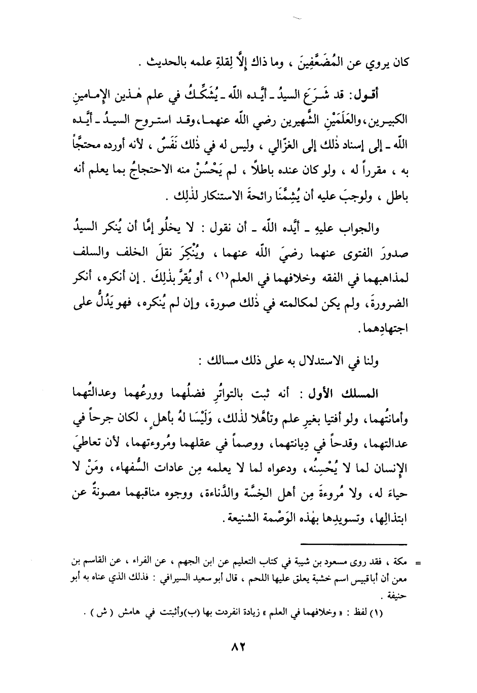 المسلك الأول: أنَّه ثبت بالتواتُرِ فضلُهما وورعُهما وعدالتُهما وأمانتُهما، ولو أفتيا بغيرِ علم وتأهَّلا لذلك، وَلَيْسا لهُ بأهلٍ، لكان جرحاً في عدالتهما، وقدحاً في دِيانتهما، ووصماً في عقلهما ومُروءتهما، لأن تعاطيَ الإنسان لما لا يُحْسِنُه، ودعواه لما لا يعلمه مِن عادات السُّفهاء، ومَنْ لا حياءَ له، ولا مُروءةَ مِن أهل الخِسَّة والدَّناءة، ووجوه مناقبهما مصونةٌ عن ابتذالِها، وتسويدِها بهذه الوَصْمة الشنيعة.
