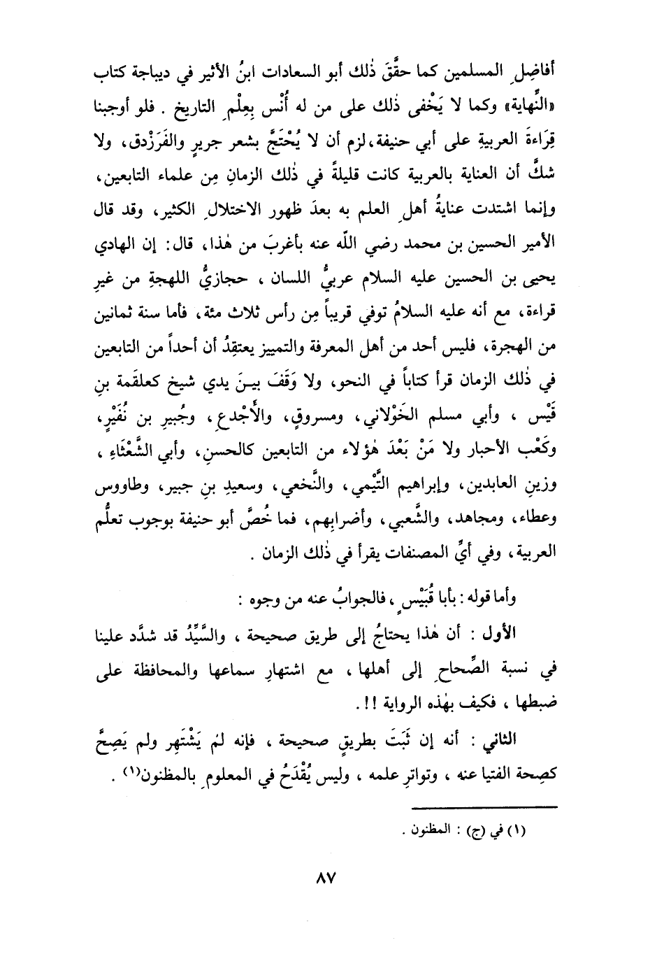 أفاضِلِ المسلمين كما حقَّقَ ذلك أبو السعادات ابنُ الأثير في ديباجة كتاب " النهاية " وكما لا يَخْفي ذلك على من له أُنْس بِعِلْمِ التاريخ. فلو أوجبنا قِرَاءةَ العربيةِ على أبي حنيفة، لزم أن لا يُحْتَجَّ بشعر جريرٍ والفَرَزْدق، ولا شكَّ أن العناية بالعربية كانت قليلةً في ذلك الزمانِ مِن علماء التابعين، وإنما اشتدت عنايةُ أهلِ العلم به بعدَ ظهور الاختلالِ الكثير، وقد قال الأمير الحسين بن محمد رضي الله عنه بأغربَ من هذا، قال: إن الهادي يحيى بن الحسين عليه السلام عربيٌّ اللسان، حجازيُّ اللهجةِ من غيرِ قراءة، مع أنَّه عليه السلامُ توفي قريباً مِن رأس ثلاث مئة، فأما سنة ثمانين من الهجرة، فليس أحد من أهل المعرفة والتمييز يعتقِدُ أن أحداً من التابعين في ذلك الزمان قرأ كتاباً في النحو، ولا وَقفَ بينَ يدي شيخ كعلقَمة بنِ قَيْس، وأبي مسلم الخَوْلاني، ومسروقٍ، والأجْدعِ، وجُبيرِ بن نُفَيْرٍ، وكَعْب الأحبار ولا مَنْ بَعْدَ هؤلاء من التابعين كالحسنِ، وأبي الشَّعْثَاءِ، وزينِ العابدين، وإبراهيم التَّيْمي، والنَّخعي، وسعيدِ بنِ جبير، وطاووس وعطاء، ومجاهد، والشعبي، وأضرابِهم، فما خُصَّ أبو حنيفة بوجوب تعلُّم العربية، وفي أيِّ المصنفات يقرأ في ذلك الزمان.