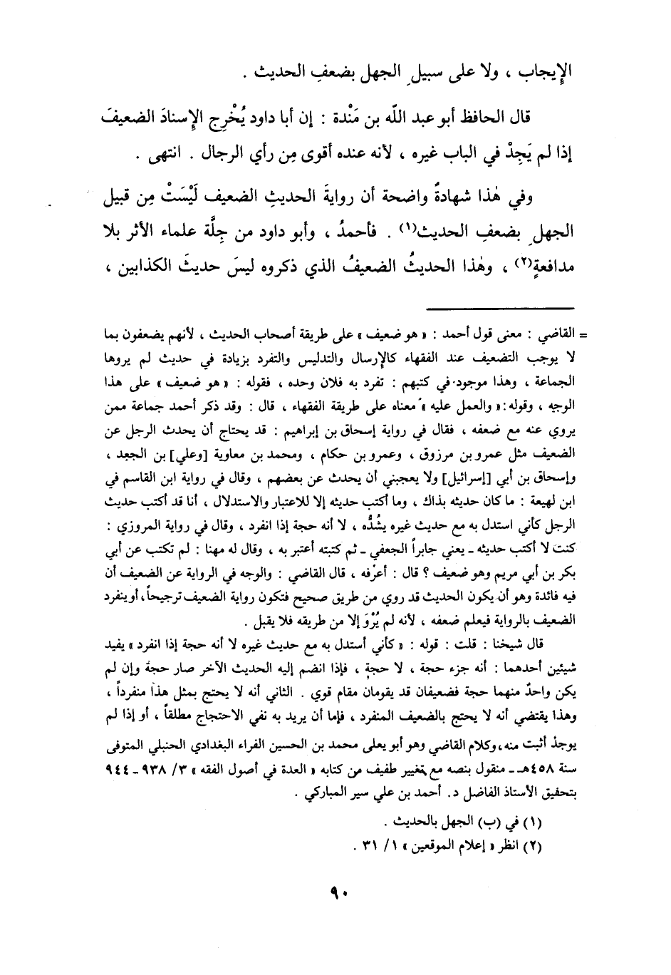 قال شيخنا: قلت: قوله: " كأني أستدل به مع حديث غيره لا أنَّه حجة إذا انفرد " يفيد شيئين أحدهما: أنَّه جزء حجة، لا حجة، فإذا انضم إليه الحديث الآخر صار حجة وإن لم يكن واحدٌ منهما حجة فضعيفان قد يقومان مقام قوي. الثاني أنَّه لا يحتج بمثل هذا منفرداً، وهذا يقتضي أنَّه لا يحتج بالضعيف المنفرد، فإما أن يريد به نفي الاحتجاج مطلقاًً، أو إذا لم يوجد أثبت منه، وكلام القاضي وهو أبو يعلى محمد بن الحسين الفراء البغدادي الحنبلي المتوفى سنة 458 هـ منقول بنصه مع تغيير طفيف من كتابه " العدة في أصول الفقه " 3/ 938 - 944 بتحقيق الأستاذ الفاضل د. أحمد بن علي سير المباركي.