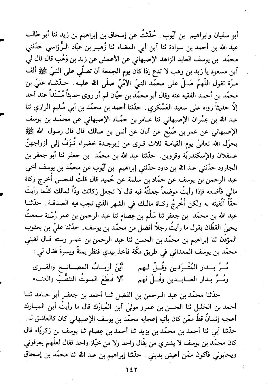 حُدِّثْتُ عَنْ إِسْحَاقَ بْنِ إِبْرَاهِيمَ بْنِ زَيْدٍ، ثنا أَبُو طَالِبٍ عَبْدُ اللَّهِ بْنُ أَحْمَدَ بْنِ سَوَادَةَ، ثنا ابْنُ أَبِي الْمَضَّاءِ، ثنا زُهَيْرُ بْنُ عَبَّادٍ الرُّؤَاسِيُّ، حَدَّثَنِي مُحَمَّدُ بْنُ يُوسُفَ الْعَابِدُ الزَّاهِدُ الْأَصْبَهَانِيُّ، عَنِ الْأَعْمَشِ، عَنْ زَيْدِ بْنِ وَهْبٍ، قَالَ: قَالَ لِيَ ابْنُ مَسْعُودٍ: يَا زَيْدُ بْنَ وَهْبٍ، §لَا تَدَعْ إِذَا كَانَ يَوْمُ الْجُمُعَةِ أَنْ تُصَلِّيَ عَلَى النَّبِيِّ صَلَّى اللهُ عَلَيْهِ وَسَلَّمَ أَلْفَ مَرَّةٍ تَقُولُ: اللَّهُمَّ صَلِّ عَلَى مُحَمَّدٍ النَّبِيِّ الْأُمِّيِّ صَلَّى اللَّهُ عَلَيْهِ حَدَّثناهُ عَلِيُّ بْنُ مُحَمَّدِ بْنِ أَحْمَدَ الْفَقِيهُ، عَنْهُ، وَقَالَ أَبُو مُحَمَّدِ بْنُ حَيَّانَ: لَمْ أَرَ رَوَى حَدِيثًا مُسْنَدًا عِنْدَ أَحَدٍ إِلَّا حَدِيثًا رَوَاهُ عَلَى سَعِيدٍ الْعَسْكَرِيِّ