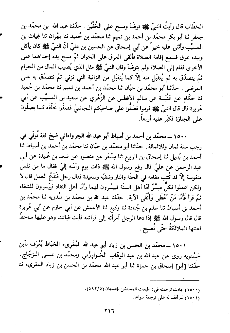 §1500 - مُحَمَّدُ بْنُ أَحْمَدَ بْنِ أَسْبَاطٍ أَبُو عَبْدِ اللَّهِ الْجَرُوَاءانِيُّ شَيْخٌ ثِقَةٌ، تُوُفِّيَ فِي رَجَبٍ سَنَةَ ثَمَانٍ وَثَلَاثِمِائَةٍ