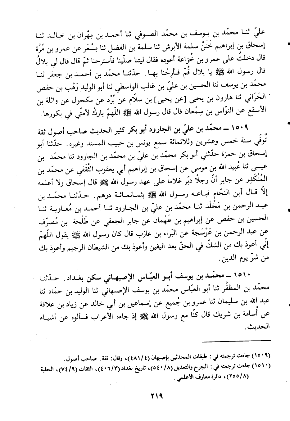 §1510 - مُحَمَّدِ بْنِ يُوسُفَ أَبُو الْعَبَّاسِ الْأَصْبَهَانِيُّ سَكَنَ بَغْدَادَ. حَدَّثَنَا مُحَمَّدُ بْنُ الْمُظَفَّرِ، ثنا أَبُو الْعَبَّاسِ مُحَمَّدُ بْنُ يُوسُفَ الْأَصْبَهَانِيُّ، ثنا الْوَلِيدُ بْنُ حَمَّادٍ، ثنا عَبْدُ اللَّهِ بْنُ سُلَيْمَانَ، ثنا عَمْرُو بْنُ جُمَيْعٍ، عَنْ إِسْمَاعِيلَ بْنِ أَبِي خَالِدٍ، عَنْ زِيَادِ بْنِ عِلَاقَةَ، عَنْ أُسَامَةَ بْنِ شَرِيكٍ قَالَ: كُنَّا مَعَ رَسُولِ اللَّهِ صَلَّى اللهُ عَلَيْهِ وَسَلَّمَ إِذْ جَاءَهُ الْأَعْرَابُ فَسَأَلُوهُ عَنْ أَشْيَاءَ. الْحَدِيثَ