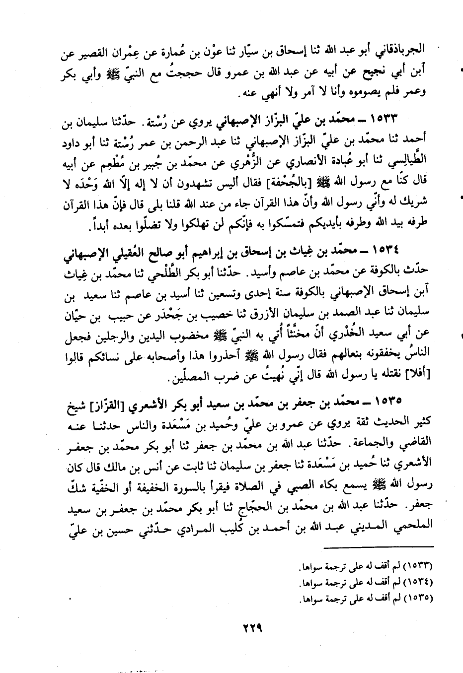 §1535 - مُحَمَّدُ بْنُ جَعْفَرِ بْنِ مُحَمَّدٍ بْنِ سَعِيدٍ أَبُو بَكْرٍ الْأَشْعَرِيُّ الْقَزَّازُ شَيْخٌ كَثِيرُ الْحَدِيثِ ثِقَةٌ، يَرْوِي عَنْ عَمْرِو بْنِ عَلِيٍّ، وَحُمَيْدِ بْنِ مَسْعَدَةَ، وَالنَّاسِ، حَدَّثَنَا عَنْهُ الْقَاضِي وَالْجَمَاعَةُ
