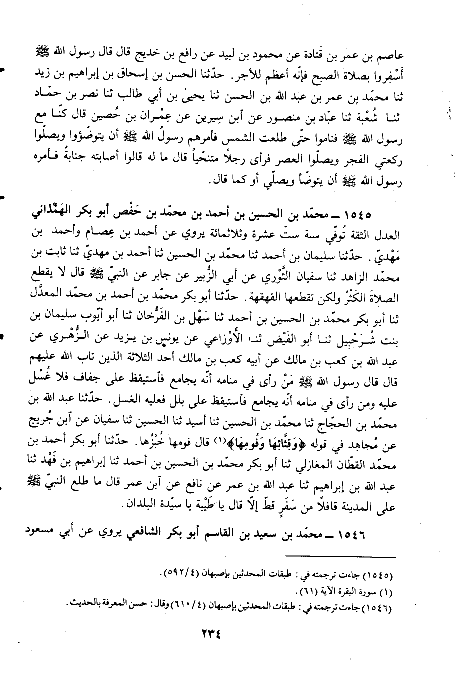 §1545 - مُحَمَّدُ بْنُ الْحُسَيْنِ بْنِ أَحْمَدَ بْنِ مُحَمَّدِ بْنِ حَفْصٍ أَبُو بَكْرٍ الْهَمَذَانِيُّ الْعَدْلُ الثِّقَةُ، تُوُفِّيَ سَنَةَ سِتَّ عَشْرَةَ وَثَلَاثِمِائَةٍ، يَرْوِي عَنْ أَحْمَدَ بْنِ عِصَامٍ وَأَحْمَدَ بْنِ مَهْدِيٍّ