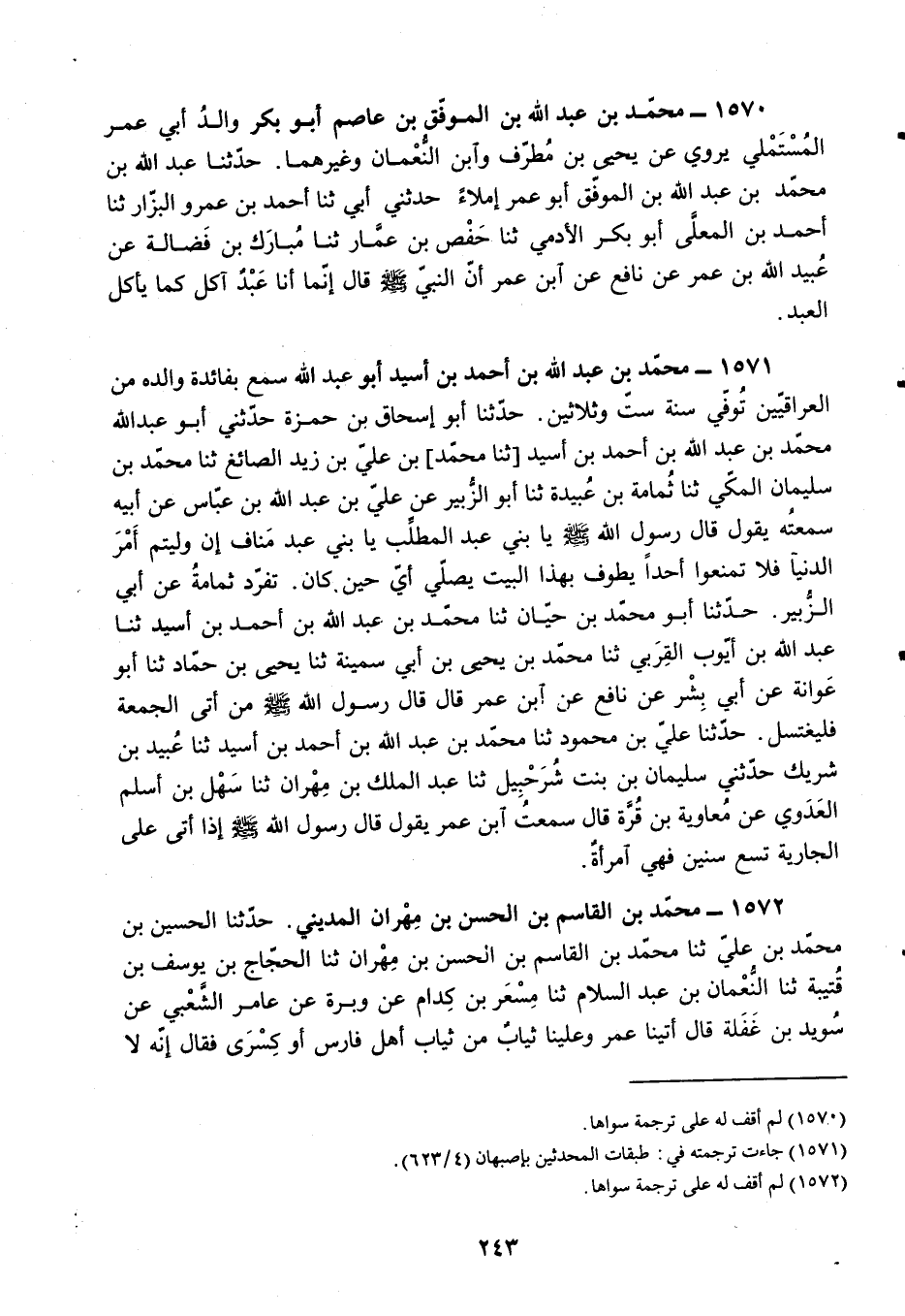 §1571 - مُحَمَّدُ بْنُ عَبْدِ اللَّهِ بْنِ أَحْمَدَ بْنِ أُسَيْدٍ أَبُو عَبْدِ اللَّهِ سَمِعَ بِفَائِدَةِ وَالِدِهِ مِنَ الْعِرَاقِيِّينَ، تُوُفِّيَ سَنَةَ سِتٍّ وَثَلَاثِينَ