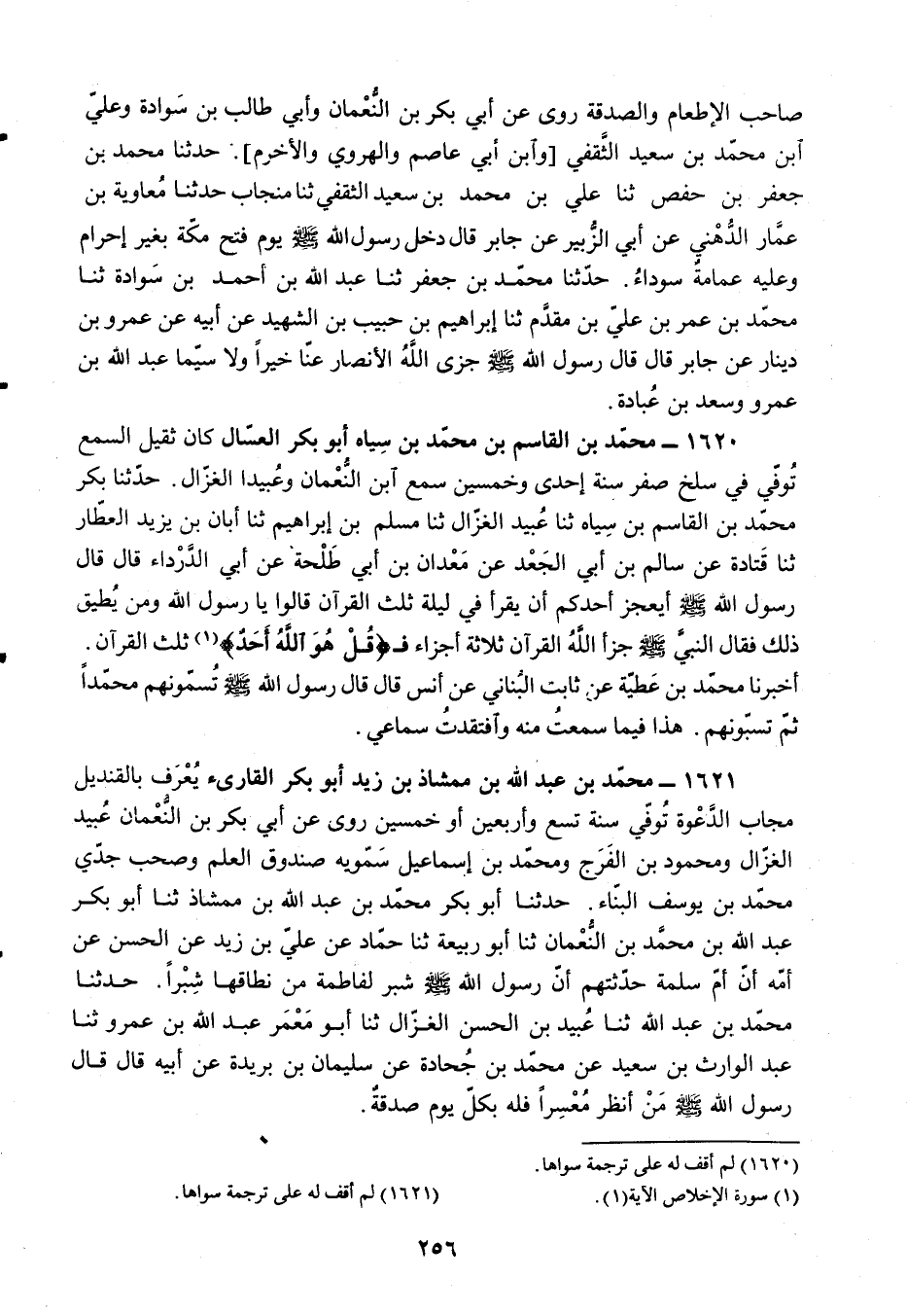 §1620 - مُحَمَّدُ بْنُ الْقَاسِمِ بْنِ مُحَمَّدِ بْنِ سِيَاهٍ أَبُو بَكْرٍ الْعَسَّالُ كَانَ ثَقِيلَ السَّمْعِ، تُوُفِّيَ فِي سِلْخِ صَفَرٍ سَنَةَ إِحْدَى وَخَمْسِينَ، سَمِعَ ابْنَ النُّعْمَانِ، وَعُبَيْدًا الْغَزَّالَ