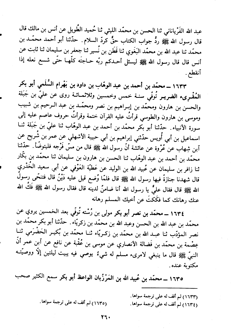 §1633 - مُحَمَّدُ بْنُ أَحْمَدَ بْنُ عَبْدِ الْوَهَّابِ بْنِ دَاوُدَ بْنِ بَهْرَامَ السُّلَمِيُّ أَبُو بَكْرٍ الْمُقْرِئُ الضَّرِيرُ تُوُفِّيَ سَنَةَ خَمْسٍ وَخَمْسِينَ وَثَلَاثِمِائَةٍ، رَوَى عَنْ عَلِيِّ بْنِ جَبَلَةَ، وَالْحَسَنِ بْنِ هَارُونَ، وَمُحَمَّدِ بْنِ إِبْرَاهِيمَ بْنِ نَصْرٍ، وَمُحَمَّدِ بْنِ عَبْدِ الرَّحِيمِ بْنِ شَبِيبٍ، وَمُوسَى بْنِ هَارُونَ، وَالطُّوسِيِّ، قَرَأْتُ عَلَيْهِ الْقُرْآنَ خَتْمَةً، وَقَرَأْتُ حُرُوفَ عَاصِمٍ عَلَيْهِ إِلَى سُورَةِ الْأَنْبِيَاءِ