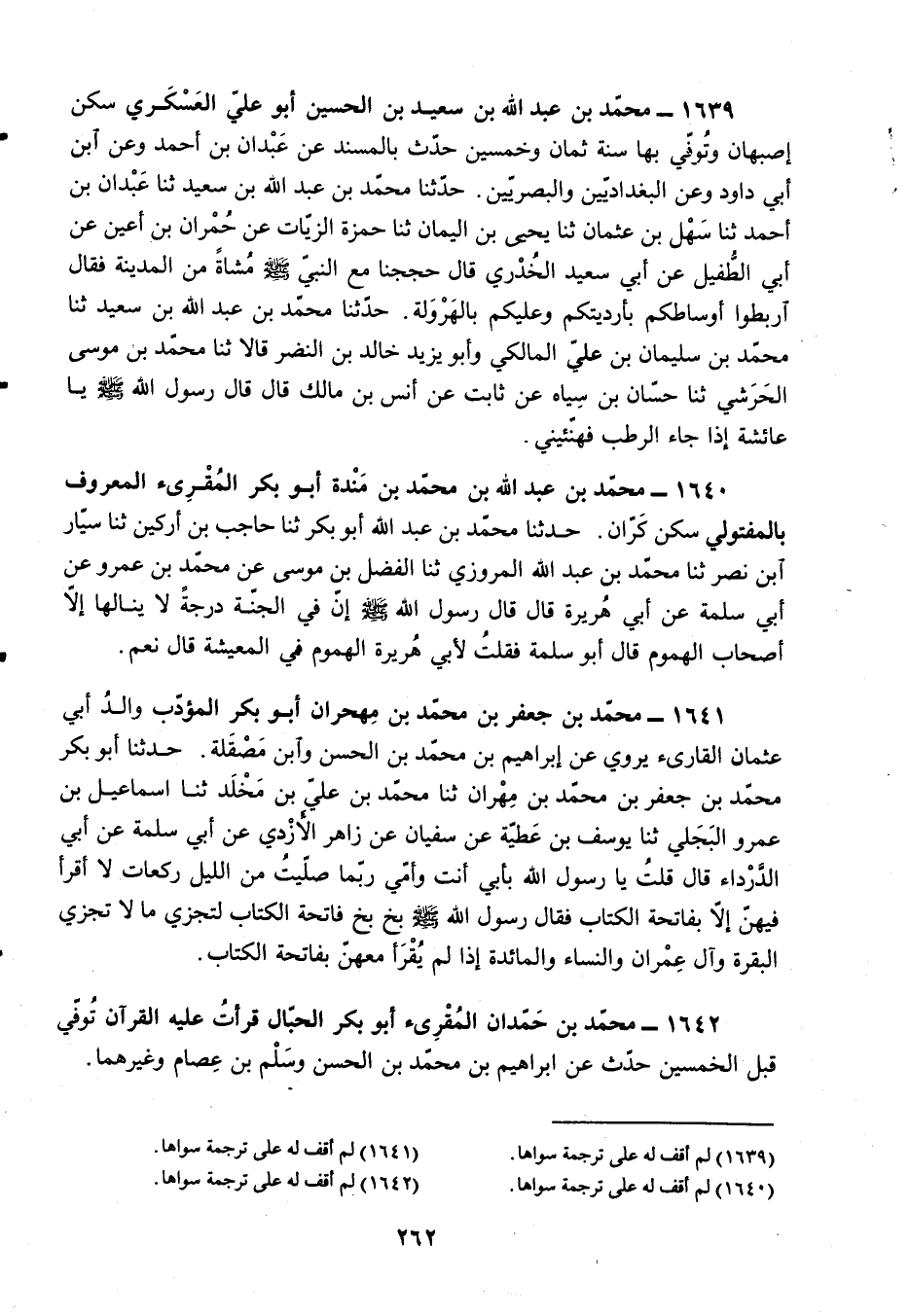 §1642 - مُحَمَّدُ بْنُ حَمْدَانَ الْمُقْرِئُ أَبُو بَكْرٍ الْحَبَّالُ قَرَأْتُ عَلَيْهِ الْقُرْآنَ، تُوُفِّيَ قَبْلَ الْخَمْسِينَ، حَدَّثَ عَنْ إِبْرَاهِيمَ بْنِ مُحَمَّدِ بْنِ الْحَسَنِ، وَسَلْمِ بْنِ عِصَامٍ وَغَيْرِهِمَا