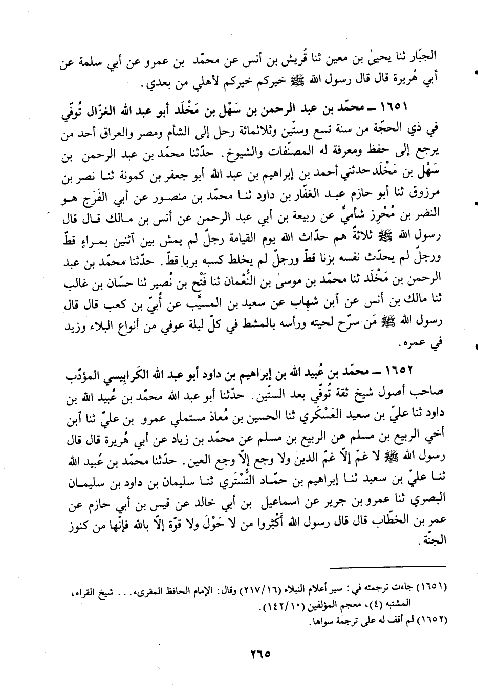 §1651 - مُحَمَّدُ بْنُ عَبْدِ الرَّحْمَنِ بْنِ سَهْلِ بْنِ مَخْلَدٍ أَبُو عَبْدِ اللَّهِ الْغَزَّالُ تُوُفِّيَ فِي ذِي الْحِجَّةِ مِنْ سَنَةِ تِسْعٍ وَسِتِّينَ وَثَلَاثِمِائَةٍ، رَحَلَ إِلَى الشَّامِ، وَمِصْرَ، وَالْعِرَاقِ، أَحَدُ مَنْ يَرْجِعِ إِلَى حِفْظٍ وَمَعْرِفَةٍ، لَهُ الْمُصَنَّفَاتُ وَالشُّيُوخُ