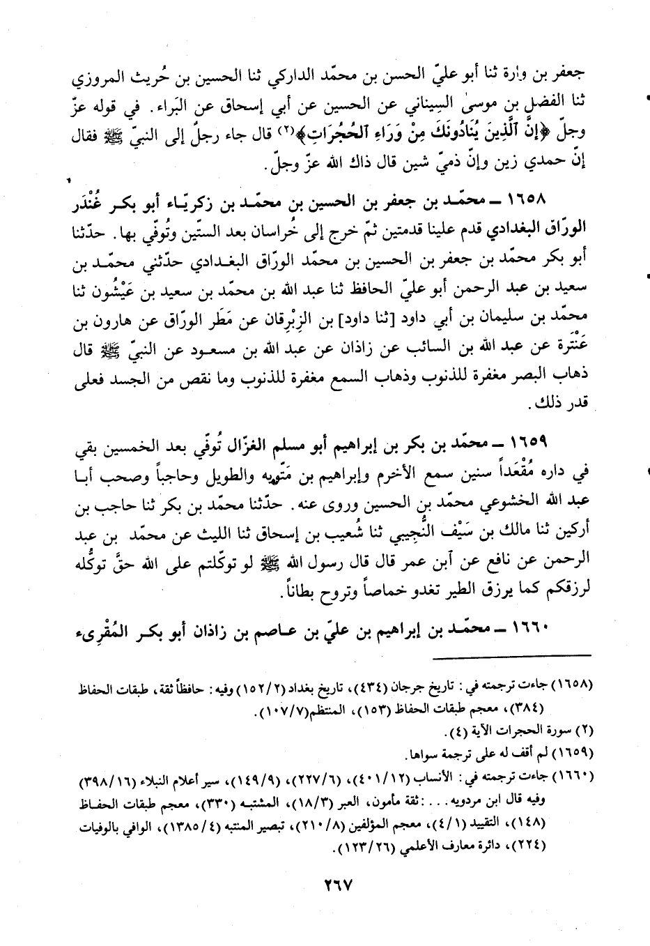§1658 - مُحَمَّدُ بْنُ جَعْفَرِ بْنِ الْحُسَيْنِ بْنِ مُحَمَّدِ بْنِ زَكَرِيَّاءَ أَبُو بَكْرٍ غُنْدَرٌ الْوَرَّاقُ الْبَغْدَادِيُّ قَدِمَ عَلَيْنَا قَدْمَتَيْنِ ثُمَّ خَرَجَ إِلَى خُرَاسَانَ بَعْدَ السِّتِّينَ وَتُوُفِّيَ بِهَا
