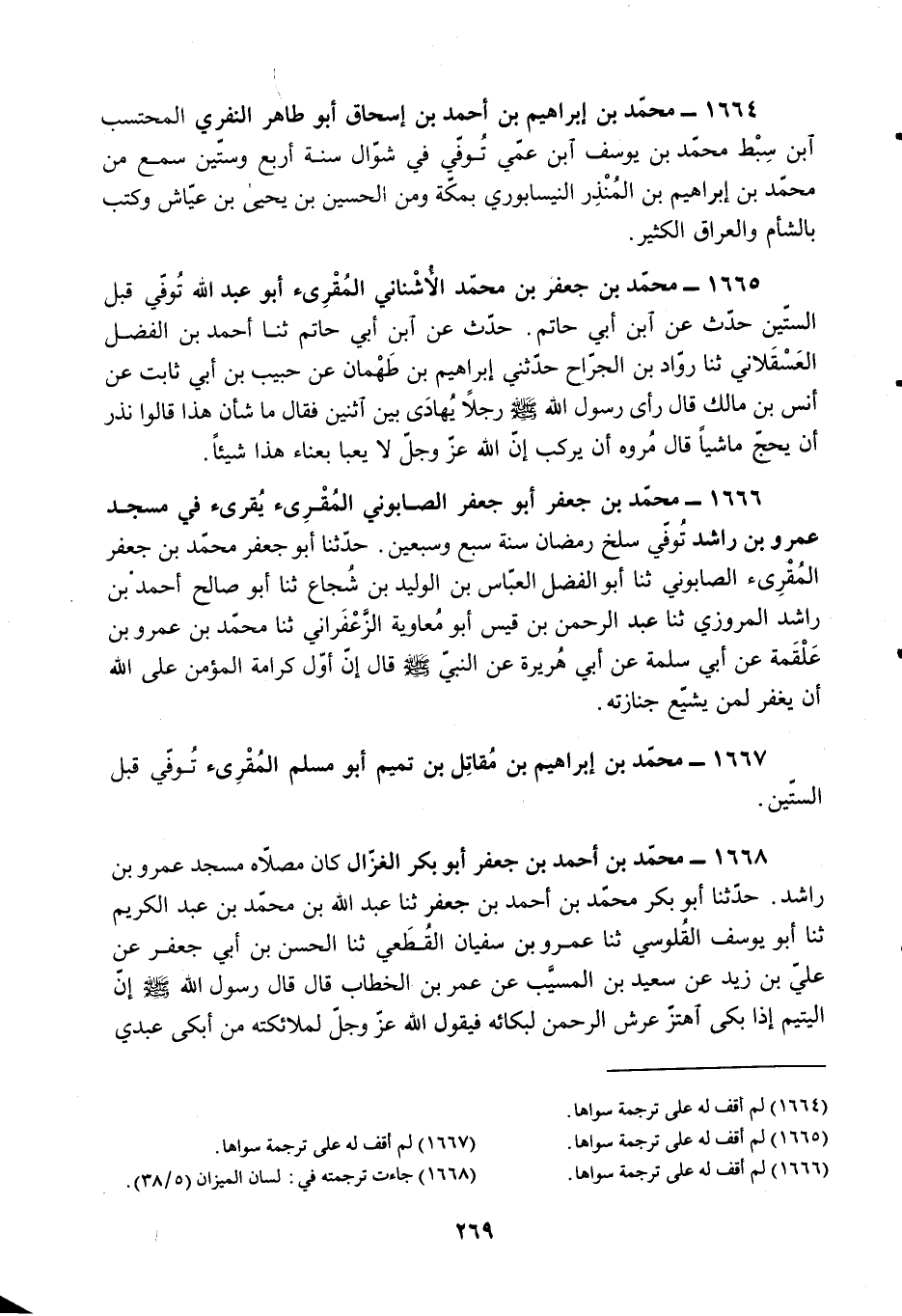 §1664 - مُحَمَّدُ بْنُ إِبْرَاهِيمَ بْنِ أَحْمَدَ بْنِ إِسْحَاقَ أَبُو طَاهِرٍ النَّفَّرِيُّ الْمُحْتَسِبُ ابْنُ سَبِطِ مُحَمَّدِ بْنِ يُوسُفَ ابْنِ عَمِّي، تُوُفِّيَ فِي شَوَّالٍ سَنَةَ أَرْبَعٍ وَسِتِّينَ، سَمِعَ مِنَ مُحَمَّدِ بْنِ إِبْرَاهِيمَ بْنِ الْمُنْذِرِ النَّيْسَابُورِيِّ بِمَكَّةَ، وَمِنَ الْحُسَيْنِ بْنِ يَحْيَى بْنِ عَيَّاشٍ، وَكَتَبَ بِالشَّامِ وَالْعِرَاقِ الْكَثِيرَ