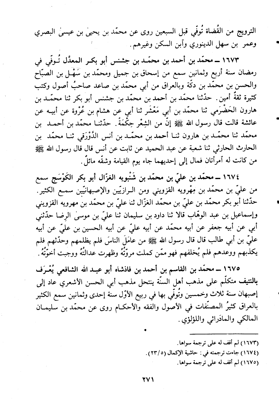 §1675 - مُحَمَّدُ بْنُ الْقَاسِمِ بْنِ أَحْمَدَ بْنِ فَاذْشَاهْ أَبُو عَبْدِ اللَّهِ الشَّافِعِيُّ يُعْرَفُ بِالنَّتِيفِ مُتَكَلِّمٌ عَلَى مَذْهَبِ أَهْلِ السُّنَّةِ، يَنْتَحِلُ مَذْهَبَ أَبِي الْحَسَنِ الْأَشْعَرِيِّ، عَادَ إِلَى أَصْبَهَانَ سَنَةَ ثَلَاثٍ وَخَمْسِينَ وَتُوُفِّيَ بِهَا فِي رَبِيعٍ الْأَوَّلِ سَنَةَ إِحْدَى وَثَمَانِينَ، سَمِعَ الْكَثِيرَ بِالْعِرَاقِ، كَثِيرُ الْمُصَنَّفَاتِ فِي الْأُصُولِ وَالْفِقْهِ وَالْأَحْكَامِ، رَوَى عَنْ مُحَمَّدِ بْنِ سُلَيْمَانَ الْمَالِكِيِّ، وَالْمَادَرَائِيِّ، وَاللُّؤْلُؤِيِّ