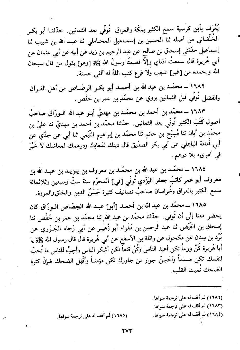 §1683 - مُحَمَّدُ بْنُ أَحْمَدَ بْنِ مُحَمَّدِ بْنِ مَهْدِيٍّ أَبُو عَبْدِ اللَّهِ الْوَرَّاقُ صَاحِبُ أُصُولٍ، كَتَبَ الْكَثِيرَ، تُوُفِّيَ بَعْدَ الثَّمَانِينَ