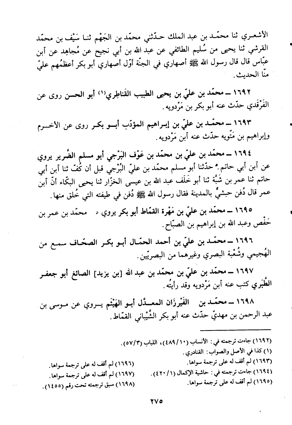 §1696 - مُحَمَّدُ بْنُ عَلِيِّ بْنِ أَحْمَدَ الْحَمَّالُ أَبُو بَكْرٍ الصِّحَافُ سَمِعَ مِنَ الْهُجَيْمِيِّ، وَشُعْبَةَ الْبَصْرِيِّ، وَغَيْرِهِمَا مِنَ الْبَصْرِيِّينَ