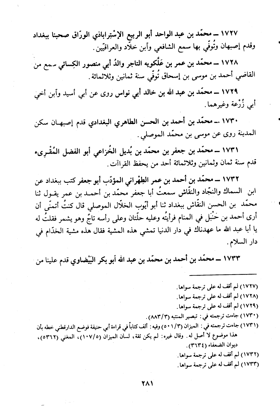 §1731 - مُحَمَّدُ بْنُ جَعْفَرِ بْنِ مُحَمَّدِ بْنِ بُدَيْلٍ الْخُزَاعِيُّ أَبُو الْفَضْلِ الْمُقْرِئُ قَدِمَ سَنَةَ ثَمَانٍ وَثَمَانِينَ وَثَلَاثِمِائَةٍ، أَحَدُ مَنْ يَحْفَظُ الْقِرَاءاتِ