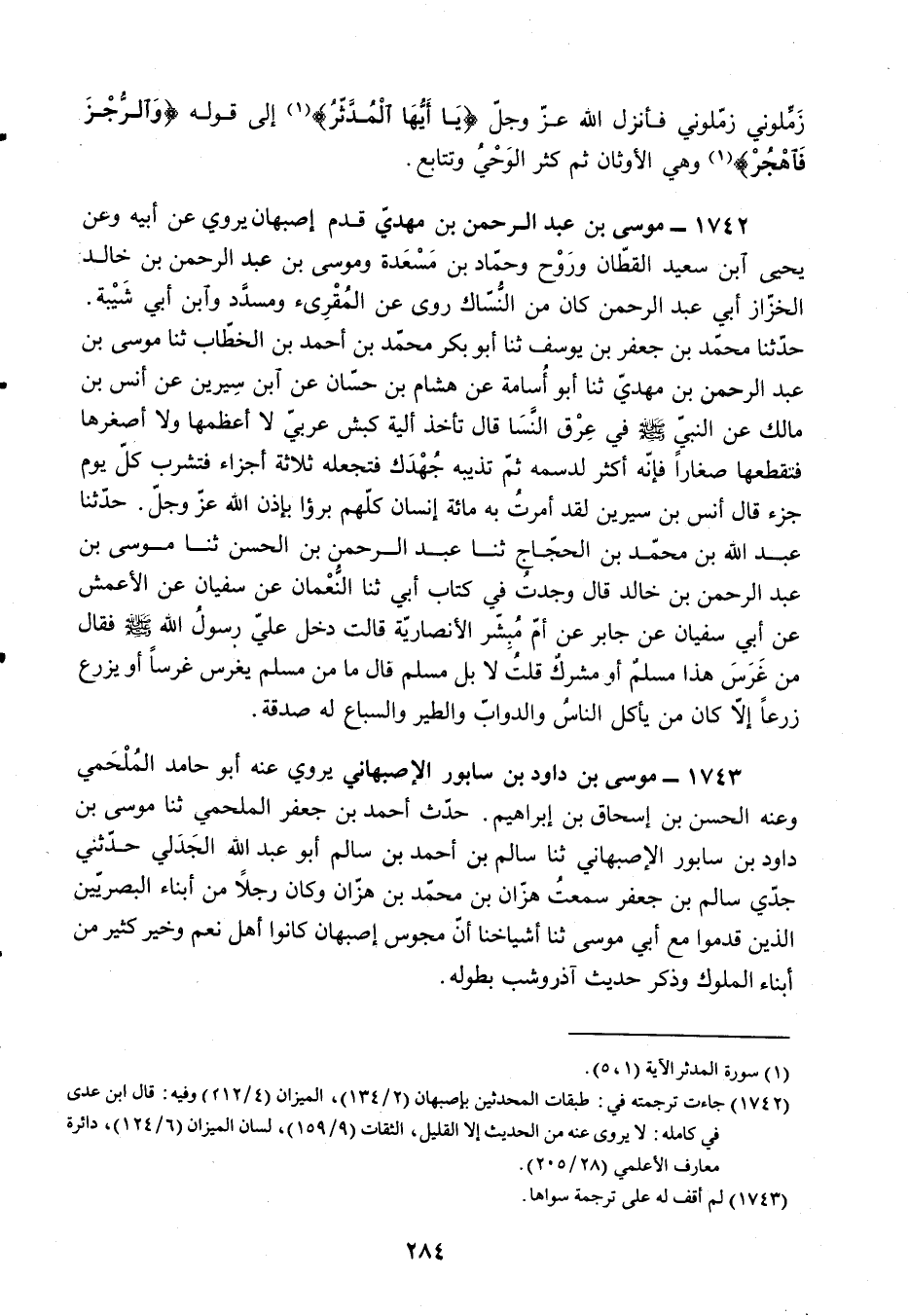 §1742 - مُوسَى بْنُ عَبْدِ الرَّحْمَنِ بْنِ مَهْدِيٍّ قَدِمَ أَصْبَهَانَ، يَرْوِي عَنْ أَبِيهِ وَعَنْ يَحْيَى بْنِ سَعِيدٍ الْقَطَّانِ، وَرَوْحٍ، وَحَمَّادِ بْنِ مَسْعَدَةَ، وَمُوسَى بْنِ عَبْدِ الرَّحْمَنِ بْنِ خَالِدٍ الْخَزَّازِ أَبِي عَبْدِ الرَّحْمَنِ، كَانَ مِنَ النُّسَّاكِ، رَوَى عَنِ الْمُقْرِئِ، وَمُسَدَّدٍ، وَابْنِ أَبِي شَيْبَةَ