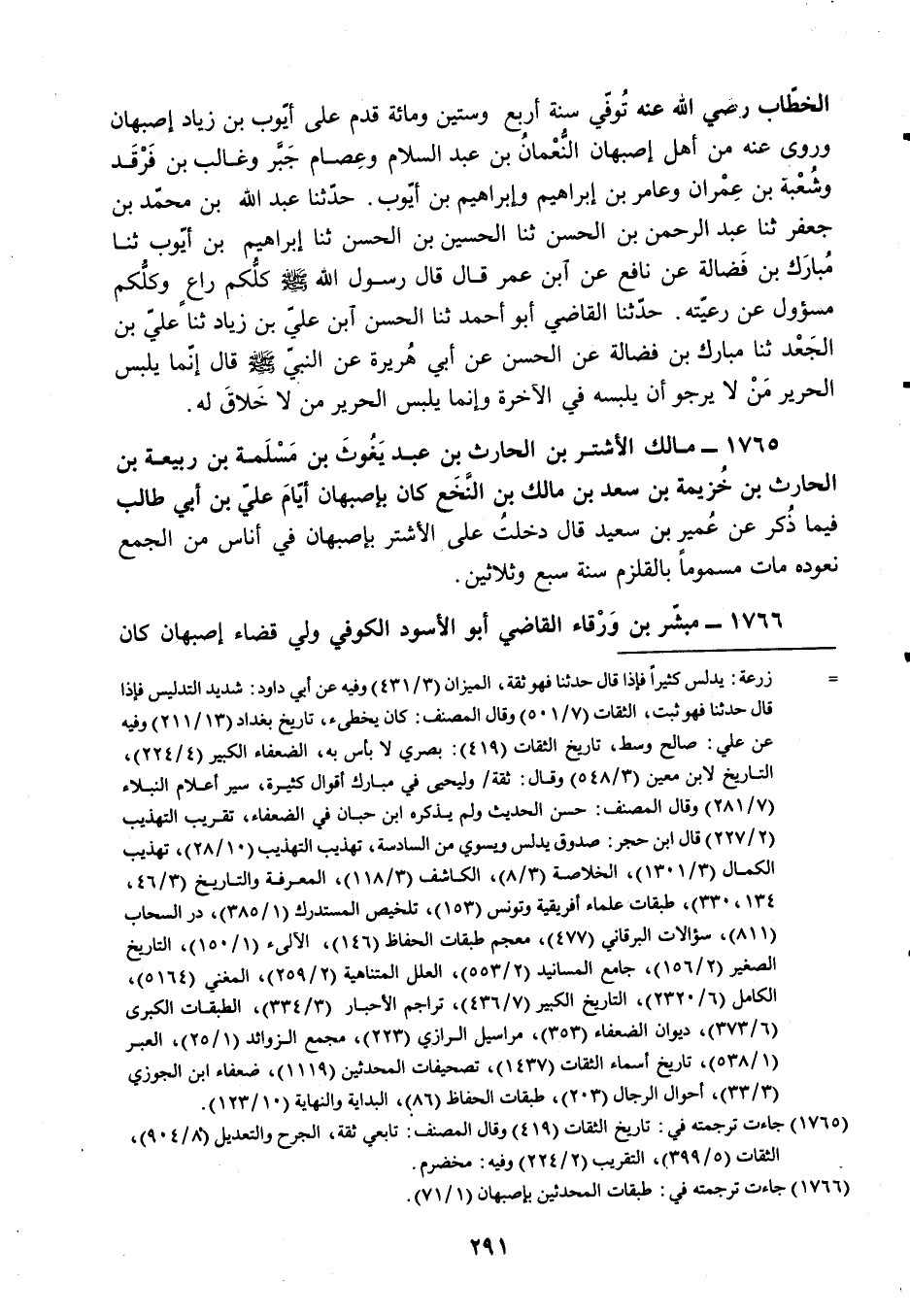 §1765 - مَالِكٌ الْأَشْتَرُ بْنُ الْحَارِثِ بْنِ عَبْدِ يَغُوثَ بْنِ مَسْلَمَةَ بْنِ رَبِيعَةَ بْنِ الْحَارِثِ بْنِ خُزَيْمَةَ بْنِ سَعْدِ بْنِ مَالِكِ بْنِ النَّخَعِ كَانَ بِأَصْبَهَانَ أَيَّامَ عَلِيِّ بْنِ أَبِي طَالِبٍ، فِيمَا ذُكِرَ عَنْ عُمَيْرِ بْنِ سَعِيدٍ، قَالَ: دَخَلْتُ عَلَى الْأَشْتَرِ بِأَصْبَهَانَ فِي أُنَاسٍ مِنَ الْجَمْعِ نَعُودُهُ. مَاتَ مَسْمُومًا بِالْقُلْزُمِ سَنَةَ سَبْعٍ وَثَلَاثِينَ