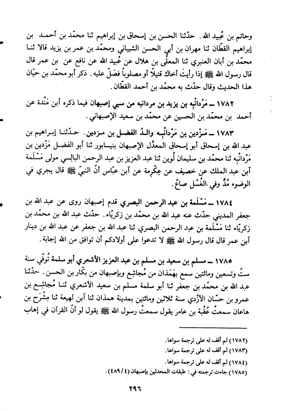 §1784 - مَسْلَمَةُ بْنُ عَبْدِ الرَّحْمَنِ الْبَصْرِيُّ قَدِمَ أَصْبَهَانَ، رَوَى عَنْ عَبْدِ اللَّهِ بْنِ جَعْفَرٍ الْمَدِينِيِّ، حَدَّثَ عَنْهُ عَبْدُ اللَّهِ بْنُ مُحَمَّدِ بْنِ زَكَرِيَّاءَ