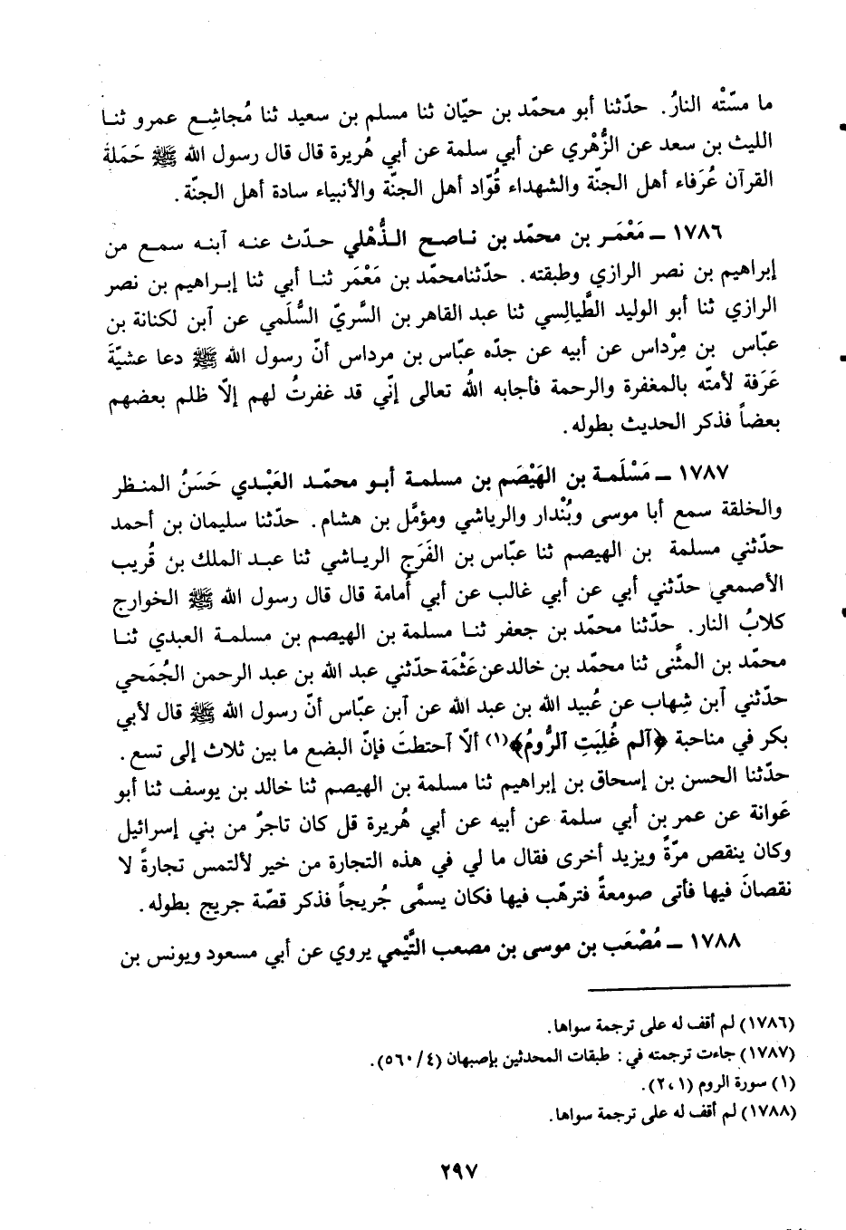 §1787 - مَسْلَمَةُ بْنُ الْهَيْصَمِ بْنِ مَسْلَمَةَ أَبُو مُحَمَّدٍ الْعَبْدِيُّ حَسَنُ الْمَنْظَرِ وَالْخِلْقَةِ، سَمِعَ أَبَا مُوسَى، وَبُنْدَارًا، وَالرِّيَاشِيَّ، وَمُؤَمَّلَ بْنَ هِشَامٍ