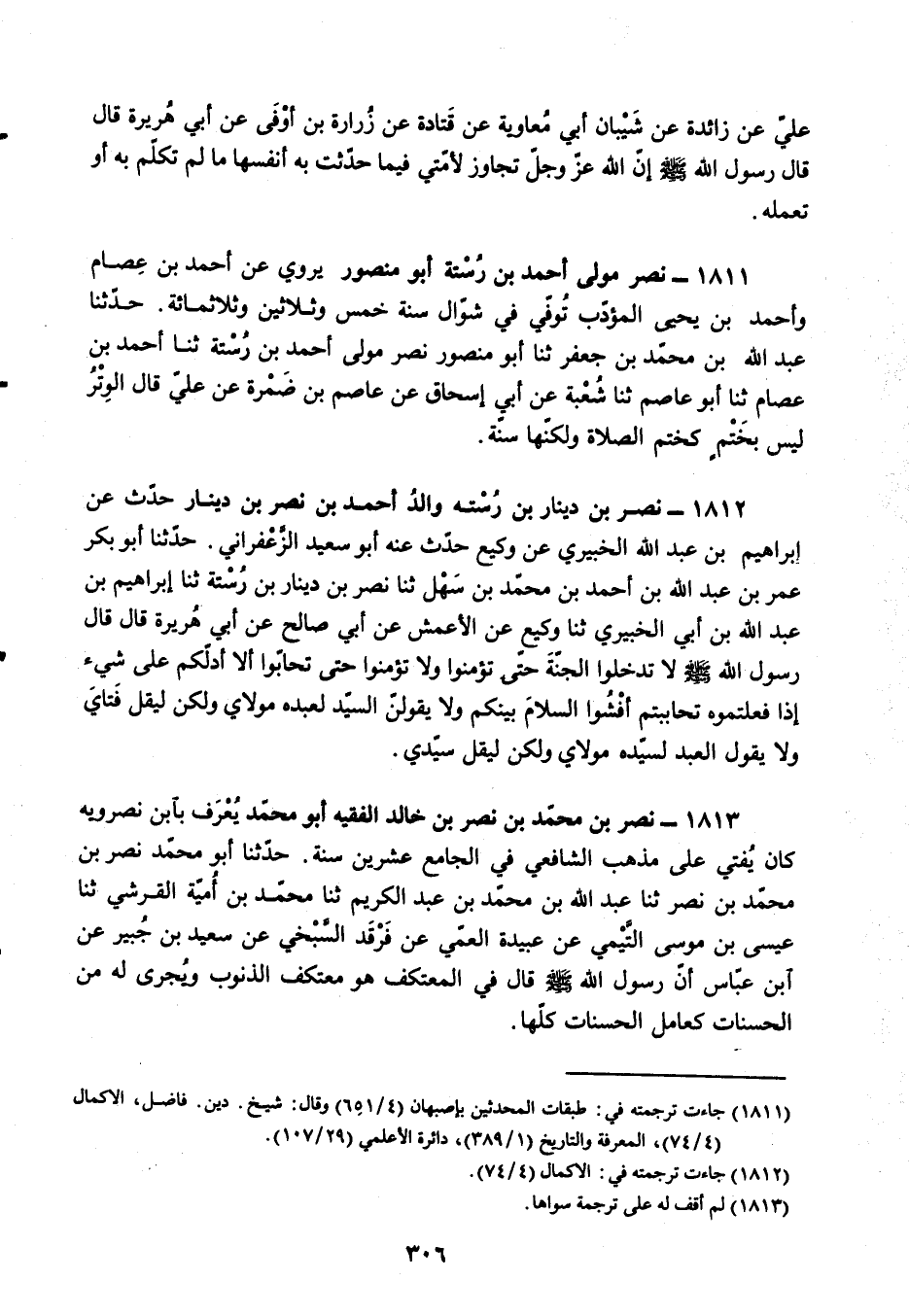 §1811 - نَصْرٌ مَوْلَى أَحْمَدَ بْنِ رُسْتَةَ أَبُو مَنْصُورٍ يَرْوِي عَنْ أَحْمَدَ بْنِ عِصَامٍ، وَأَحْمَدَ بْنِ يَحْيَى الْمُؤَدِّبِ، تُوُفِّيَ فِي شَوَّالٍ سَنَةَ خَمْسٍ وَثَلَاثِينَ وَثَلَاثِمِائَةٍ