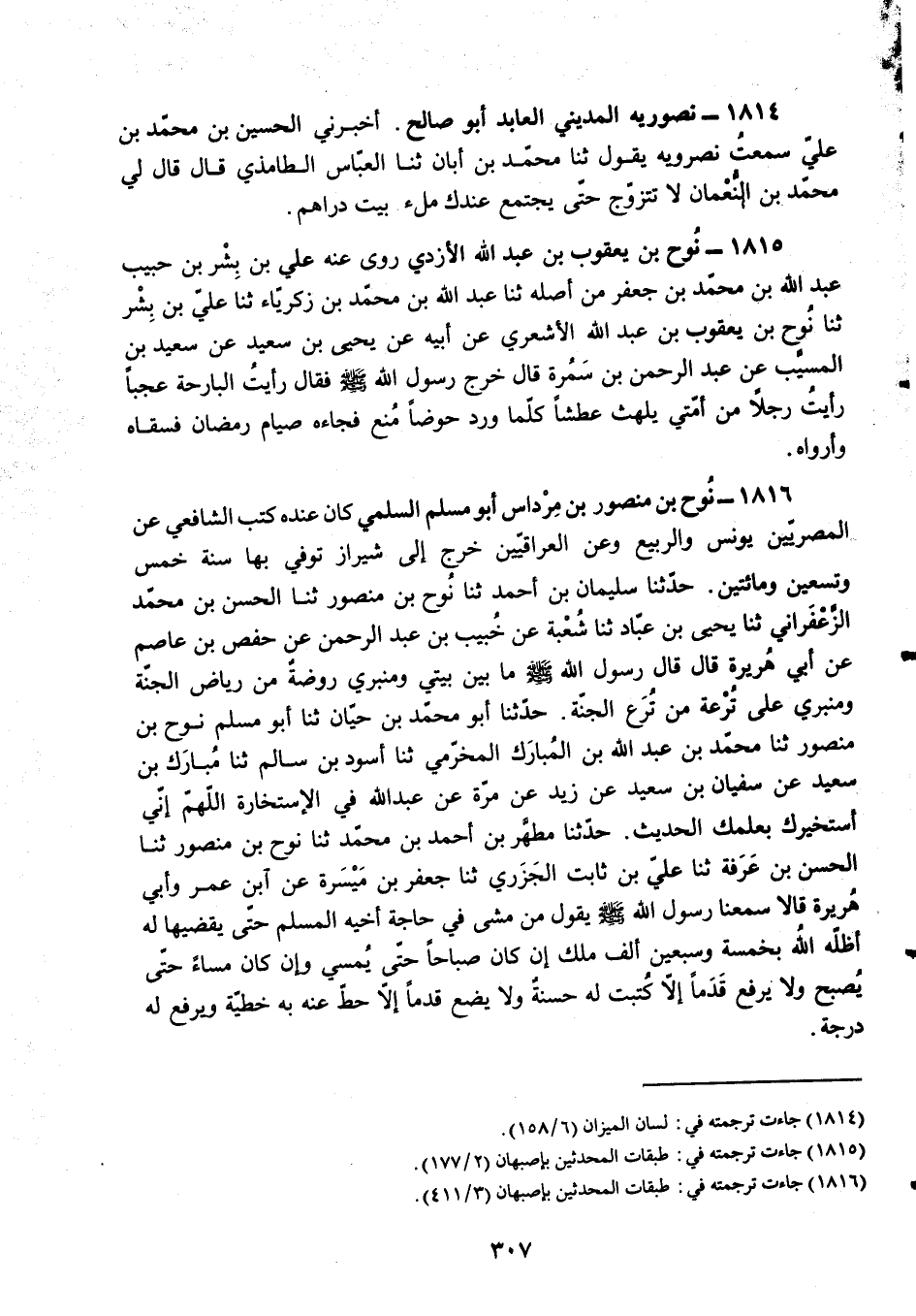 §1816 - نُوحُ بْنُ مَنْصُورِ بْنِ مِرْدَاسٍ أَبُو مُسْلِمٍ السُّلَمِيُّ كَانَ عِنْدَهُ كُتُبُ الشَّافِعِيِّ عَنِ الْمِصْرِيِّينَ: يُونُسَ، وَالرَّبِيعَ، وَعَنِ الْعِرَاقِيِّينَ، خَرَجَ إِلَى شِيرَازَ، تُوُفِّيَ بِهَا سَنَةَ خَمْسٍ وَتِسْعِينَ وَمِائَتَيْنِ