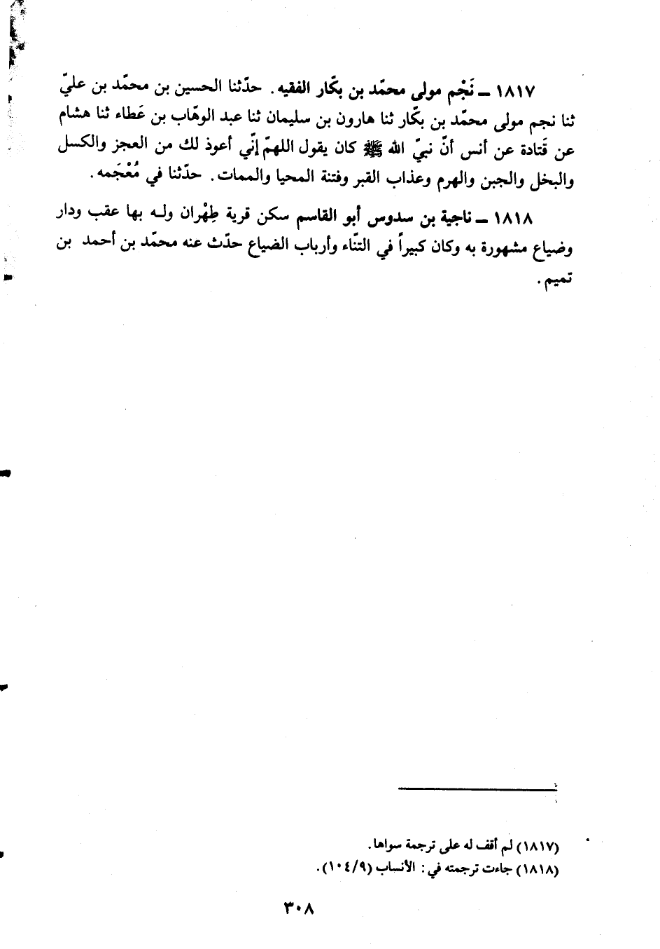 §1818 - نَاجِيَةُ بْنُ سَدُوسٍ أَبُو الْقَاسِمِ سَكَنَ قَرْيَةَ طِهْرَانَ وَلَهُ بِهَا عَقِبٌ وَدَارٌ وَضِياعٌ مَشْهُورَةٌ بِهِ، وَكَانَ كَبِيرًا فِي التُّنَّاءِ وَأَرْبَابِ الضِّيَاعِ، حَدَّثَ عَنْهُ مُحَمَّدُ بْنُ أَحْمَدَ بْنِ تَمِيمٍ