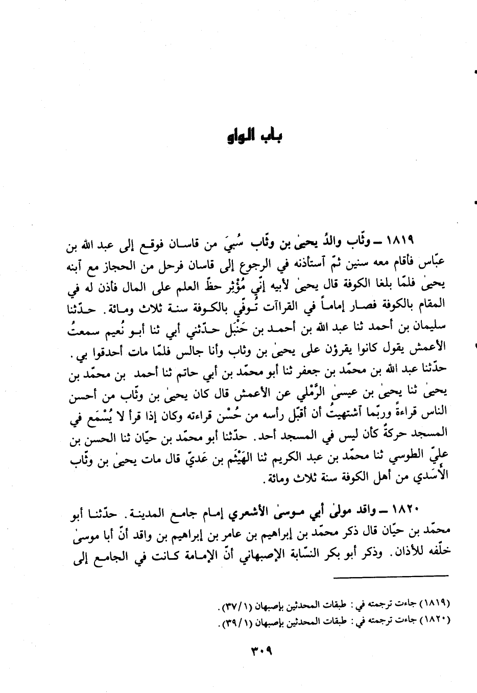 §1819 - وَثَّابٌ وَالِدُ يَحْيَى بْنِ وَثَّابٍ سُبِيَ مِنْ قَاسَانَ فَوَقَعَ إِلَى عَبْدِ اللَّهِ بْنِ عَبَّاسٍ فَأَقَامَ مَعَهُ سِنِينَ، ثُمَّ اسْتَأْذَنَهُ فِي الرُّجُوعِ إِلَى قَاسَانَ فَرَحَلَ مِنَ الْحِجَازِ مَعَ ابْنِهِ يَحْيَى، فَلَمَّا بَلَغَا الْكُوفَةَ قَالَ يَحْيَى لِأَبِيهِ: إِنِّي مُؤْثِرٌ حَظَّ الْعِلْمِ عَلَى الْمَالِ، فَأَذِنَ لَهُ فِي الْمُقَامِ بِالْكُوفَةِ فَصَارَ إِمَامًا فِي الْقِرَاءَاتِ، تُوُفِّيَ بِالْكُوفَةِ سَنَةَ ثَلَاثٍ وَمِائَةٍ