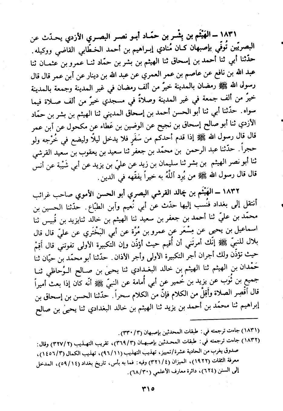 §1831 - الْهَيْثَمُ بْنُ بِشْرِ بْنِ حَمَّادٍ أَبُو نَصْرٍ الْبَصْرِيُّ الْأَزْدِيُّ يُحَدِّثُ عَنِ الْبَصْرِيِّينَ، تُوُفِّيَ بِأَصْبَهَانَ، كَانَ مُنَادِي إِبْرَاهِيمَ بْنِ أَحْمَدَ الْخَطَّابِيِّ الْقَاضِي وَوَكِيلَهُ