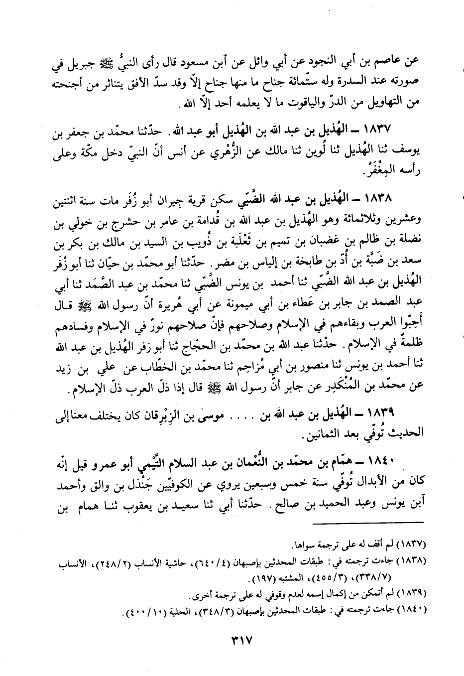 §1838 - الْهُذَيْلُ بْنُ عَبْدِ اللَّهِ الضَّبِّيُّ سَكَنَ قَرْيَةَ جِيرَانَ، أَبُو زُفَرَ، مَاتَ سَنَةَ اثْنَتَيْنِ وَعِشْرِينَ وَثَلَاثِمِائَةٍ، وَهُوَ الْهُذَيْلُ بْنُ عَبْدِ اللَّهِ بْنِ قُدَامَةَ بْنِ عَامِرِ بْنِ حَشْرَجِ بْنِ خَوْلِيِّ بْنِ نَضْلَةَ بْنِ ظَالِمِ بْنِ غَضْبَانَ بْنِ تَمِيمِ بْنِ ثَعْلَبَةَ بْنِ ذُوَيْبِ بْنِ السَّيِّدِ بْنِ مَالِكِ بْنِ بَكْرِ بْنِ سَعْدِ بْنِ ضَبَّةَ بْنِ أَدِّ بْنِ طَابِخَةَ بْنِ إِلْيَاسَ بْنِ مُضَرَ