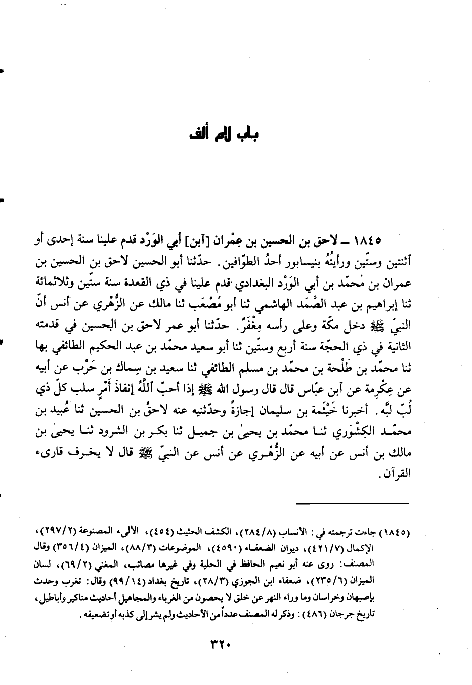 §1845 - لَاحِقُ بْنُ الْحُسَيْنِ بْنِ عِمْرَانَ بْنِ أَبِي الْوَرْدِ قَدِمَ عَلَيْنَا سَنَةَ إِحْدَى أَوِ اثْنَتَيْنِ وَسِتِّينَ، وَرَأَيْتُهُ بِنَيْسَابُورَ، أَحَدُ الطَّوَّافِينَ