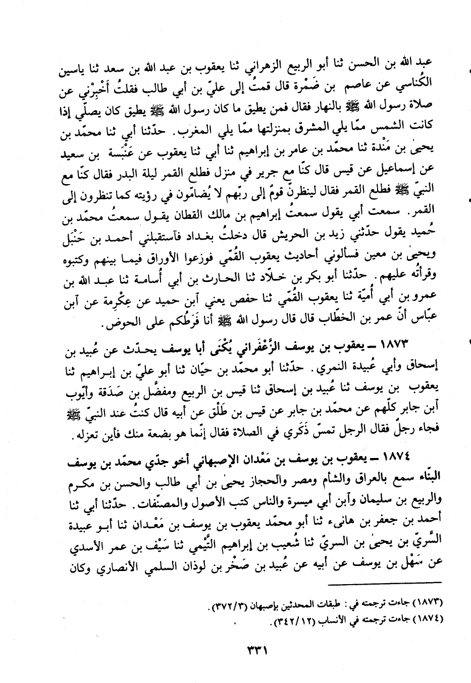 §1874 - يَعْقُوبُ بْنُ يُوسُفَ بْنِ مَعْدَانَ الْأَصْبَهَانِيُّ أَخُو جَدِّي مُحَمَّدِ بْنِ يُوسُفَ الْبَنَّاءِ، سَمِعَ بِالْعِرَاقِ، وَالشَّامِ، وَمِصْرَ، وَالْحِجَازِ، يَحْيَى بْنَ أَبِي طَالِبٍ، وَالْحَسَنَ بْنَ مُكْرَمٍ، وَالرَّبِيعَ بْنَ سُلَيْمَانَ، وَابْنَ أَبِي مَيْسَرَةَ، وَالنَّاسَ، كَتَبَ الْأُصُولَ وَالْمُصَنَّفَاتِ