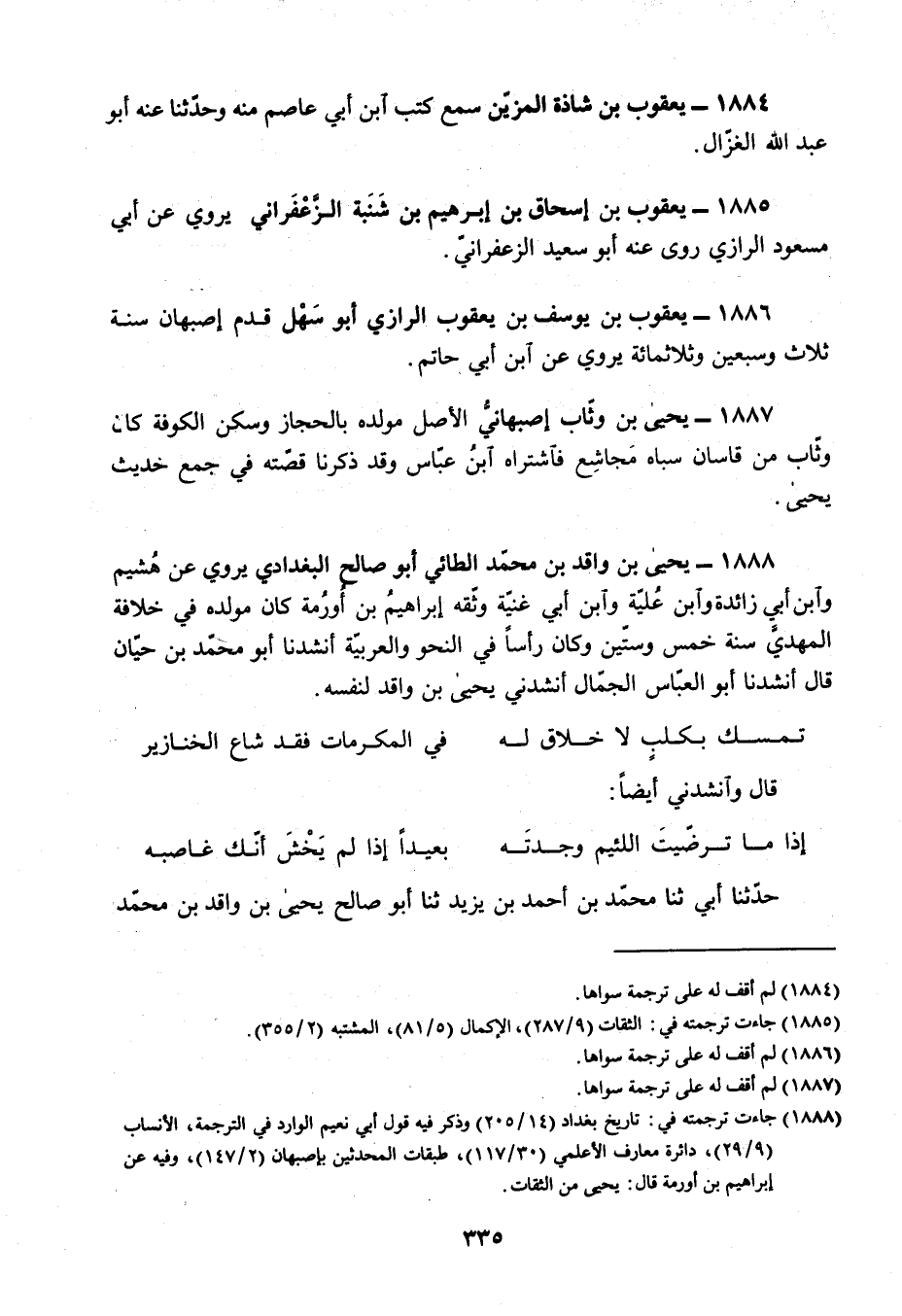 §1888 - يَحْيَى بْنُ وَاقِدِ بْنِ مُحَمَّدٍ الطَّائِيُّ أَبُو صَالِحٍ الْبَغْدَادِيُّ يَرْوِي عَنْ هُشَيْمٍ، وَابْنِ أَبِي زَائِدَةَ، وَابْنِ عُلَيَّةَ، وَابْنِ أَبِي غَنِيَّةَ، وَثَّقَهُ إِبْرَاهِيمُ بْنُ أَورُمَةَ، كَانَ مَوْلِدُهُ فِي خِلَافَةِ الْمَهْدِيِّ سَنَةَ خَمْسٍ وَسِتِّينَ، وَكَانَ رَأْسًا فِي النَّحْوِ وَالْعَرَبِيَةِ