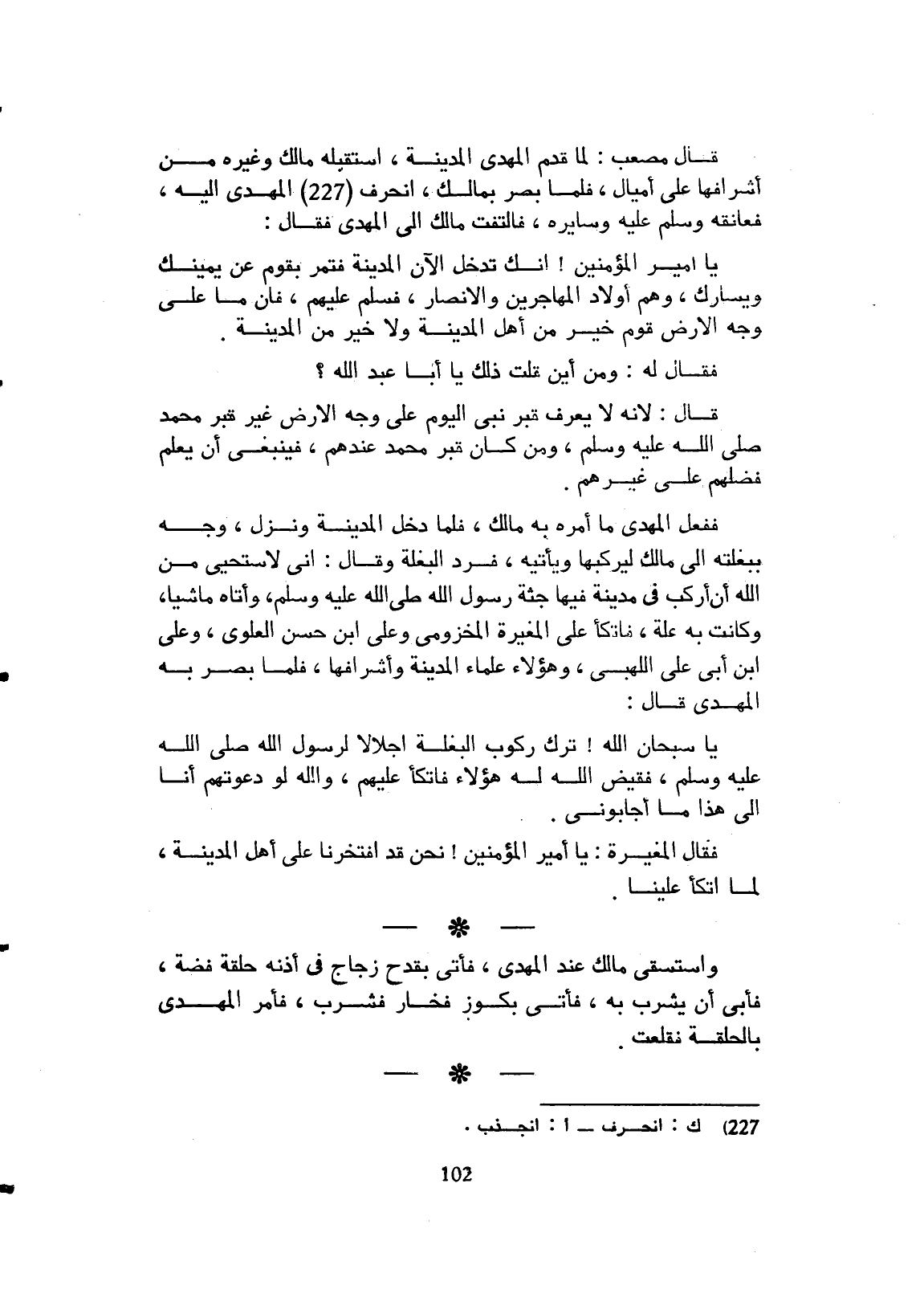 قال مصعب لما قدم المهدي المدينة استقبله مالك وغيره من أشرافها على أميال، فلما أبصر بمالك انحرف المهدي إليه فعانقه وسلم عليه وسايره.